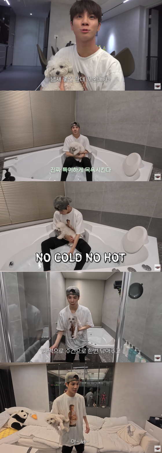정동원의 반려견 목욕 방법은 욕조를 사용하는 것. 옷을 갈아입은 그는 반려견과 함께 욕조에 들어가 천천히 목욕을 시작했다.