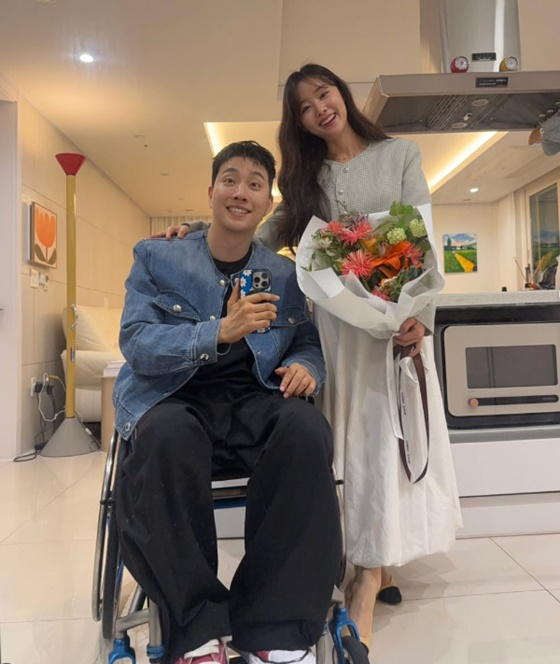 공개된 사진에는 꽃다발을 들고 서 있는 송지은과 휠체어에 앉아 있는 박위의 모습이 담겼다.