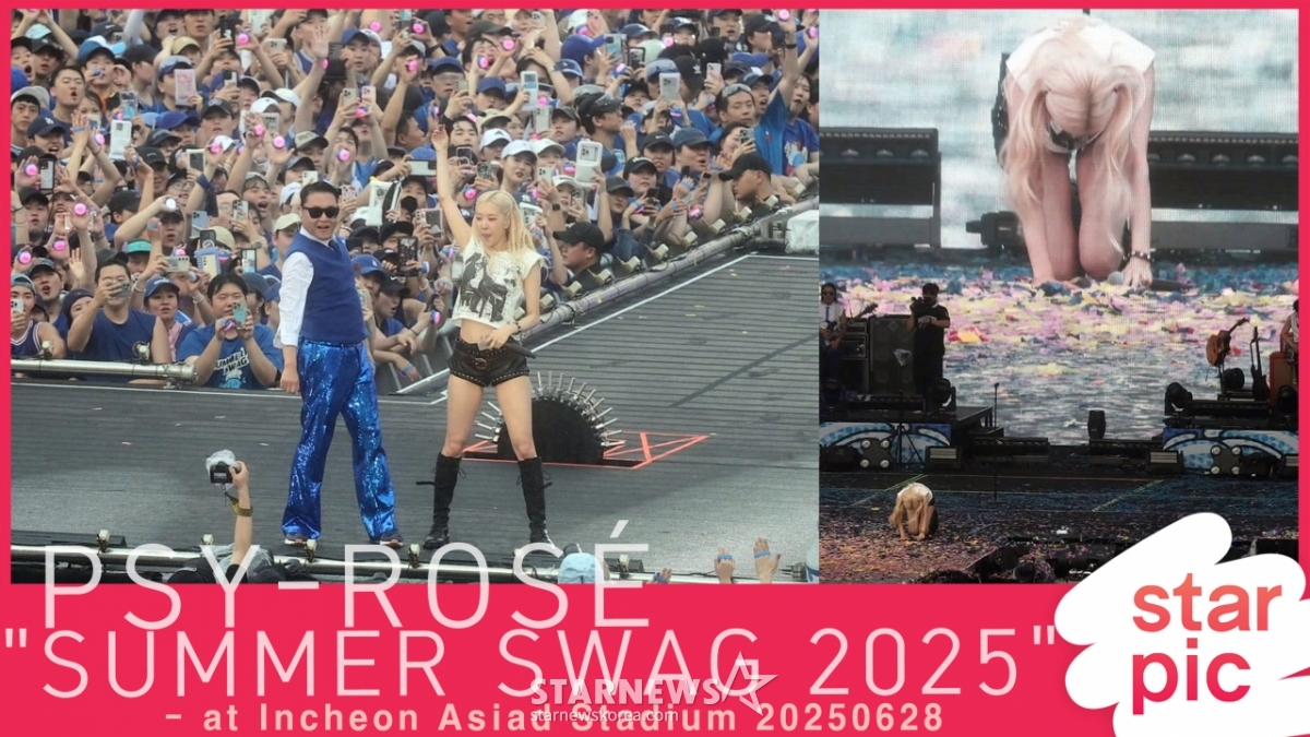 연예방송싸이-로제 '흠뻑! 아파트!' [★영상]발행 : 2025.06.28 ・ 19:27인천=임성균 기자가수 싸이와 그룹 블랙핑크 로제가 28일 오후 인천광역시 서구 아시아드경기장에서 열린 '흠뻑쇼 SUMMER SWAG 2025' 공연에서 멋진 무대를 선보이고 있다. 2025.06.28<저작권자 © 스타뉴스, 무단전재 및 재배포 금지>공항패션싸이PSY흠뻑쇼SUMMERSWAG박재상추천 기사임성균 기자기자홈좋아요 연예-방송의 인기 급상승 뉴스연예-방송의 최신 뉴스
