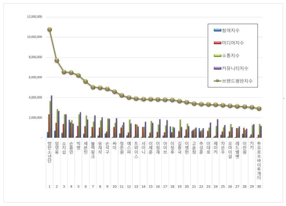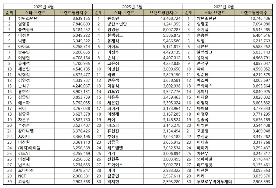 2025년 6월 스타 브랜드평판 30위 순위는 방탄소년단, 임영웅, 소지섭, 손흥민, 빅뱅, 세븐틴, 블랙핑크, 유재석, 손석구, 싸이, 정준원, 에스파, 트와이스, 샤이니, 이제훈, 이정재, 아이브, 이정후, 김종국, 이병헌, 고윤정, 추성훈, 이대호, 페이커, 차은우, 오마이걸, 레드벨벳, 이찬원, 키키, 투모로우바이투게더 순으로 분석됐다.