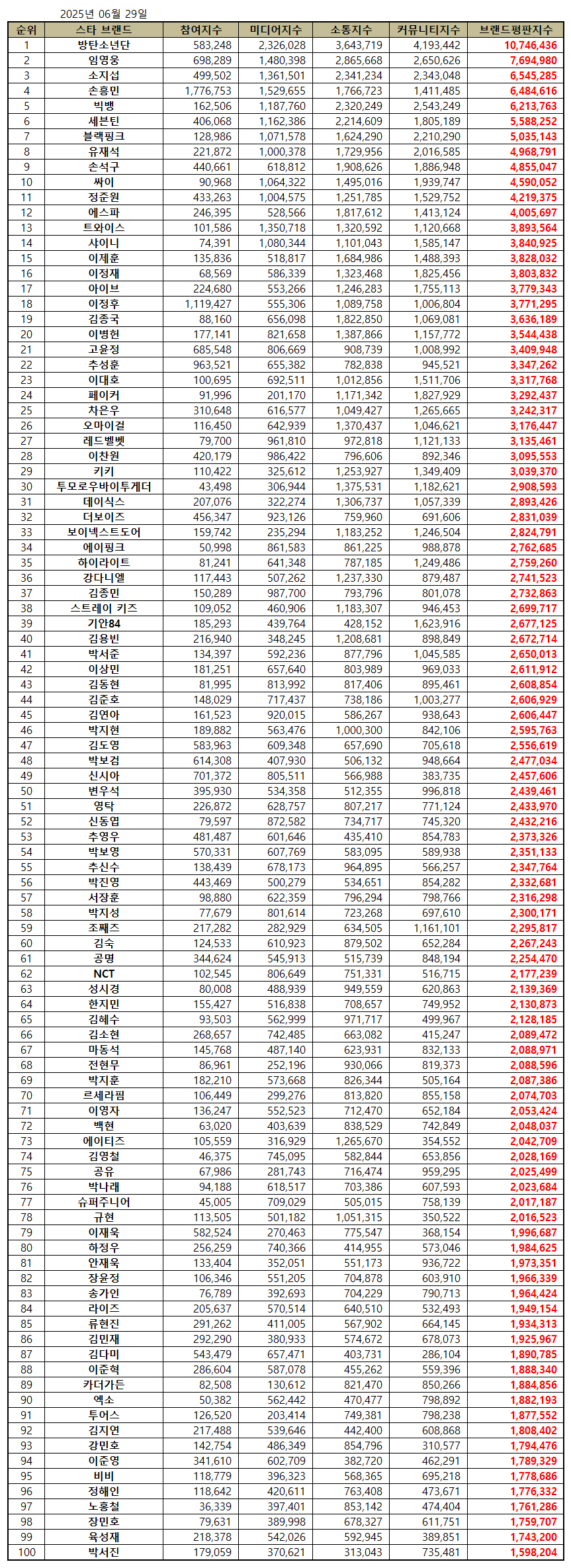 스타 브랜드평판 2025년 6월 빅데이터 분석 100위는 방탄소년단, 임영웅, 소지섭, 손흥민, 빅뱅, 세븐틴, 블랙핑크, 유재석, 손석구, 싸이, 정준원, 에스파, 트와이스, 샤이니, 이제훈, 이정재, 아이브, 이정후, 김종국, 이병헌, 고윤정, 추성훈, 이대호, 페이커, 차은우, 오마이걸, 레드벨벳, 이찬원, 키키, 투모로우바이투게더, 데이식스, 더보이즈, 보이넥스트도어, 에이핑크, 하이라이트, 강다니엘, 김종민, 스트레이 키즈, 기안84, 김용빈, 박서준, 이상민, 김동현, 김준호, 김연아, 박지현, 김도영, 박보검, 신시아, 변우석, 영탁, 신동엽, 추영우, 박보영, 추신수, 박진영, 서장훈, 박지성, 조째즈, 김숙, 공명, NCT, 성시경, 한지민, 김혜수, 김소현, 마동석, 전현무, 박지훈, 르세라핌, 이영자, 백현, 에이티즈, 김영철, 공유, 박나래, 슈퍼주니어, 규현, 이재욱, 하정우, 안재욱, 장윤정, 송가인, 라이즈, 류현진, 김민재, 김다미, 이준혁, 카더가든, 엑소, 투어스, 김지연, 강민호, 이준영, 비비, 정해인, 노홍철, 장민호, 육성재, 박서진 순으로 분석됐다.