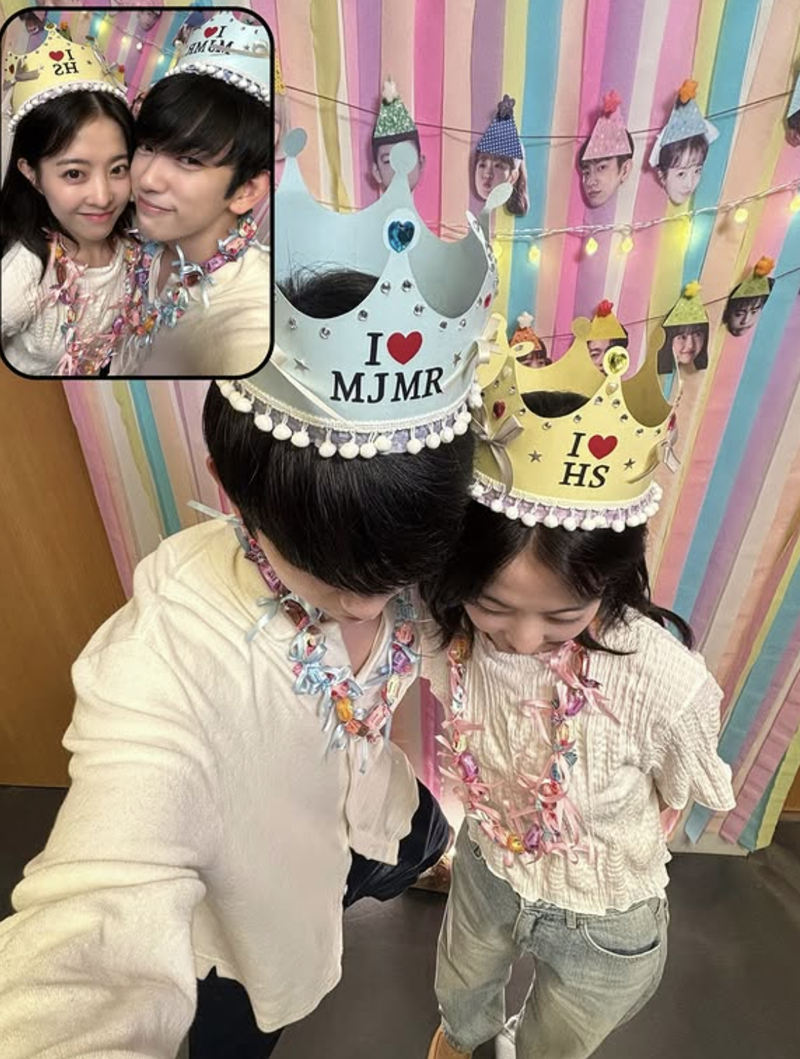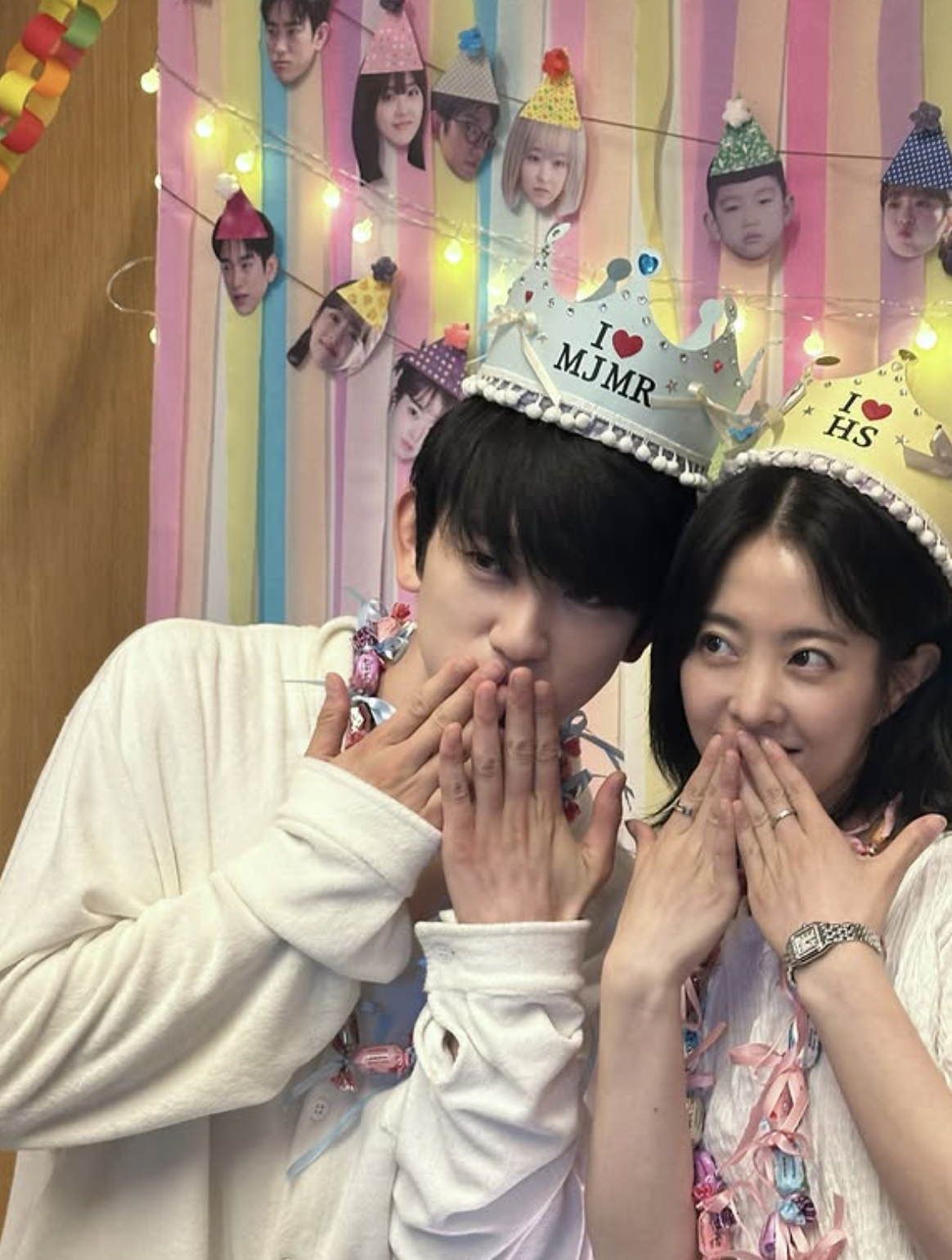박보영은 극 중 미지와 미래의 이니셜이 담긴 'MJ' 'MR'이 적힌 왕관을, 박진영은 호수를 의미하는 'HS'가 적힌 왕관을 쓰고 카메라 앞에서 포즈를 취하고 있다. 두 사람의 비슷한 그림체가 보는 이들의 시선을 사로잡았다.