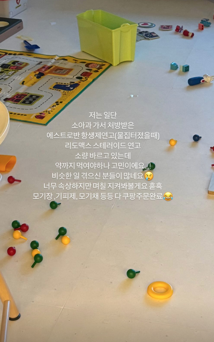 이어 손연재는 "저는 일단 소아과 가서 처방받은 에스트로반 항생제 연고(물집 터졌을때) 리도맥스 스테로이드 연고 소량 바르고 있는데 약까지 먹여야 하나 고민이에요"라며 "비슷한 일 겪으신 분들이 많네요. 너무 속상하지만 며칠 지켜봐볼게요 흑흑. 모기장 기피제 모기채 등 다 쿠팡 주문 완료"라고 전했다.