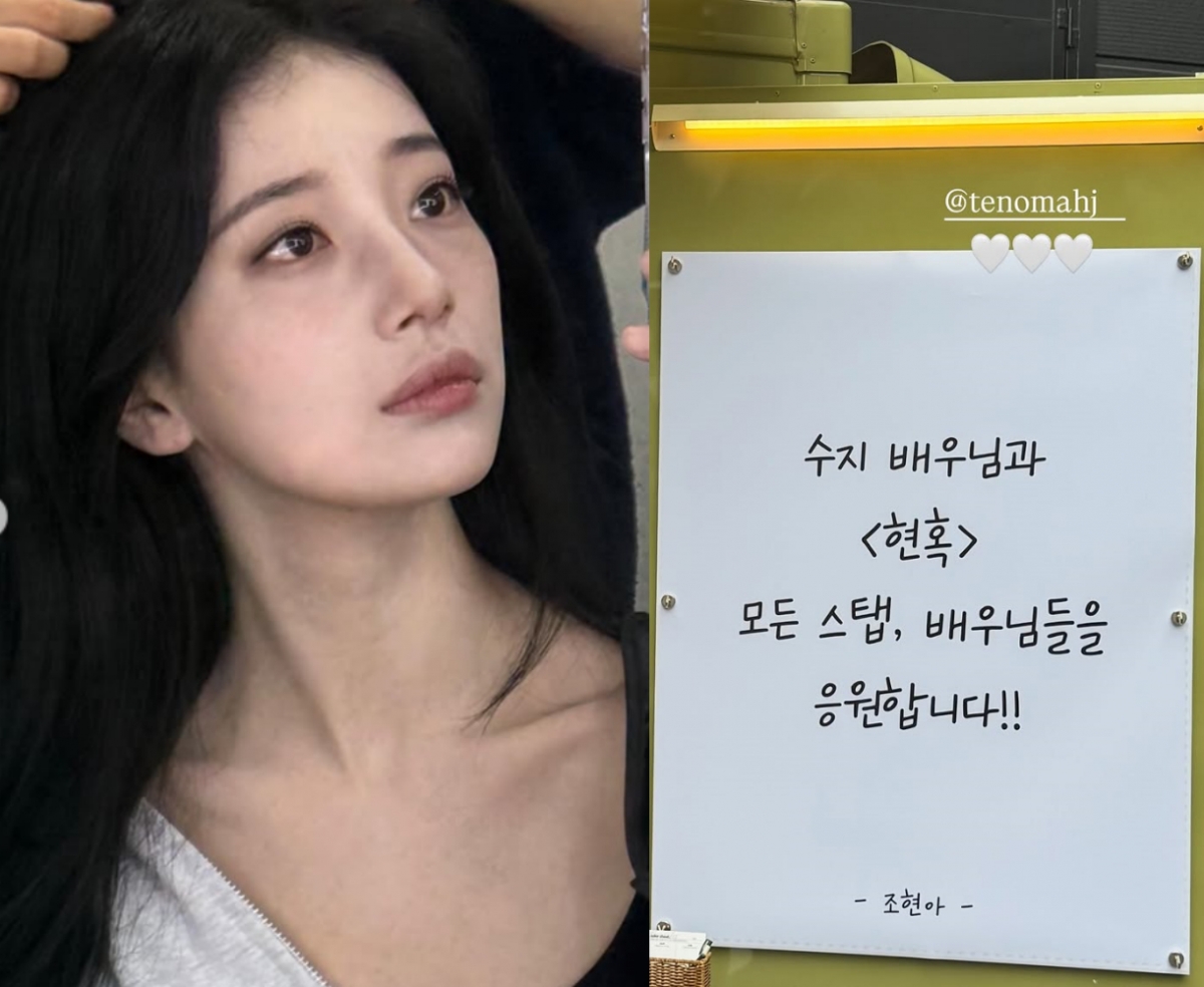공개된 사진 속에는 조현아가 수지가 촬영 중인 디즈니+ 시리즈 '현혹' 현장에 보낸 커피차의 일부가 담겼다. 해당 커피차에는 '수지 배우님과 '현혹' 모든 스태프, 배우님들을 응원합니다'라고 적으며 수지를 응원했다.