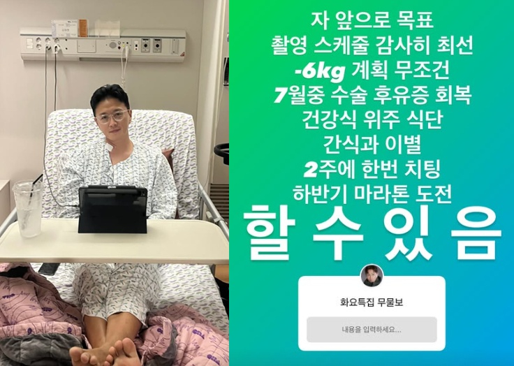 진태현은 1일 갑상선암 수술 이후 근황을 알리고 "자 앞으로 목표. 촬영 스케줄 감사히 최선. -6kg 계획 무조건. 7월 중 수술 후유증 회복. 건강식 위주 식단. 간식과 이별. 2주에 한번 치팅. 하반기 마라톤 도전. 할수 있음"이라고 전했다.