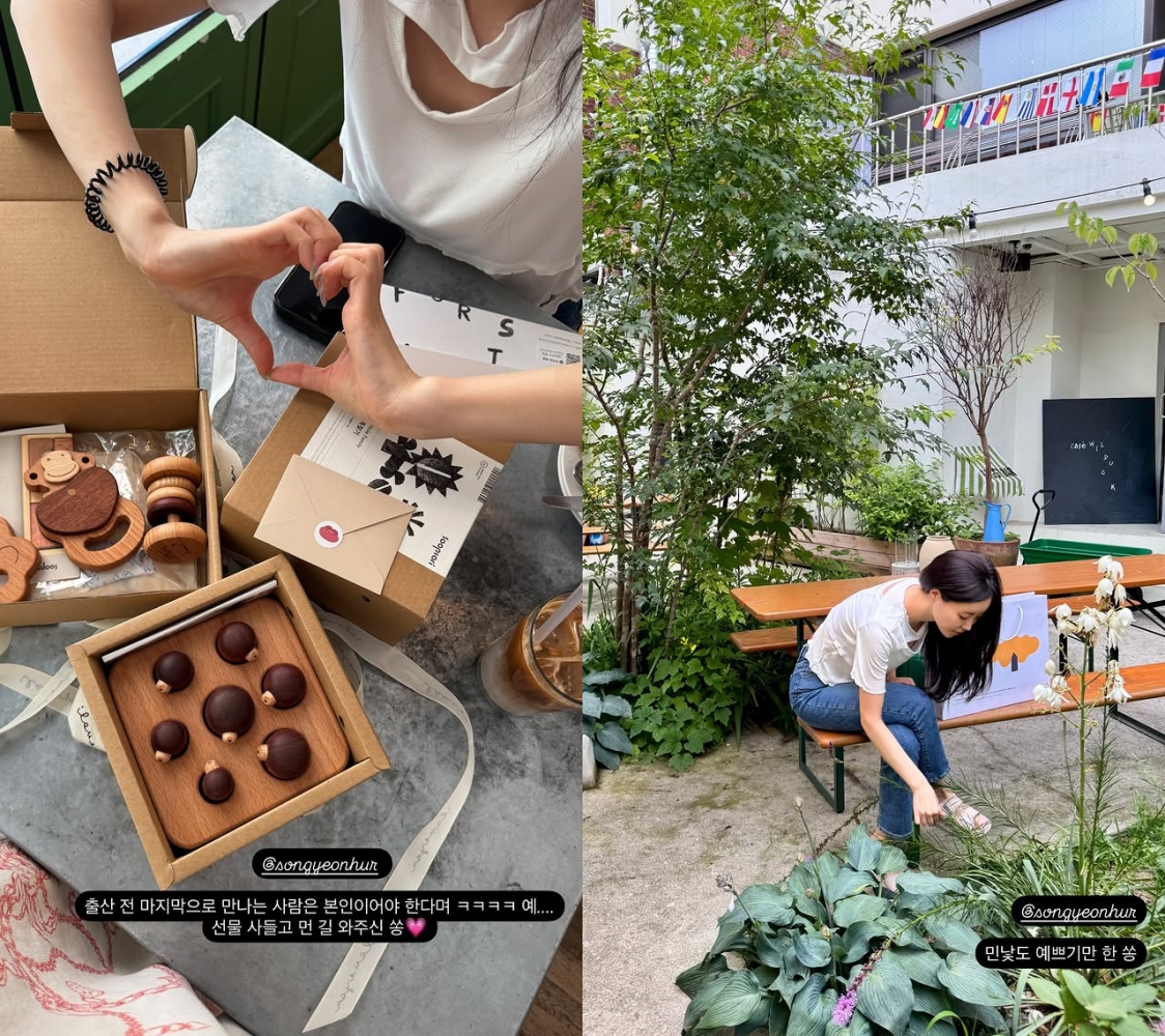 공개된 사진 속에는 한 카페에서 만난 듯한 허송연과 레이디 제인의 모습이 담겼고, 허송연은 출산을 앞둔 레이디 제인에게 선물을 건네는 한편 손하트로 순산을 기원했다. 이어 레이디 제인은 허송연이 의자에 앉아있는 모습을 공개하고 "민낯도 예쁘기만 한 쏭"이라고 애정을 표현했다.