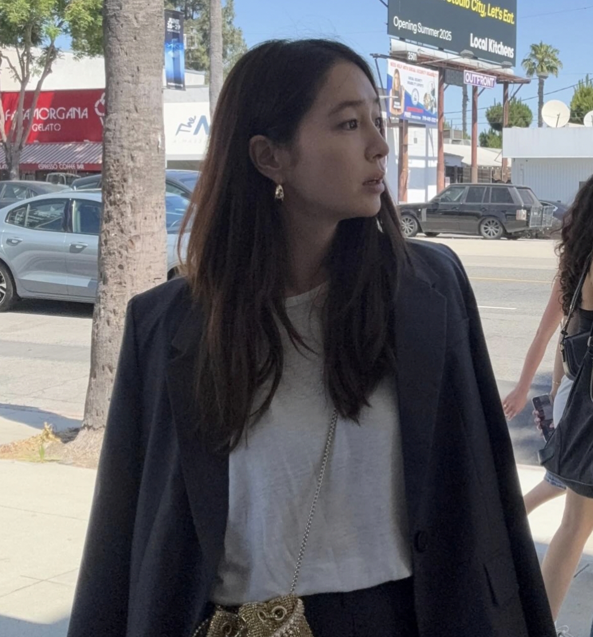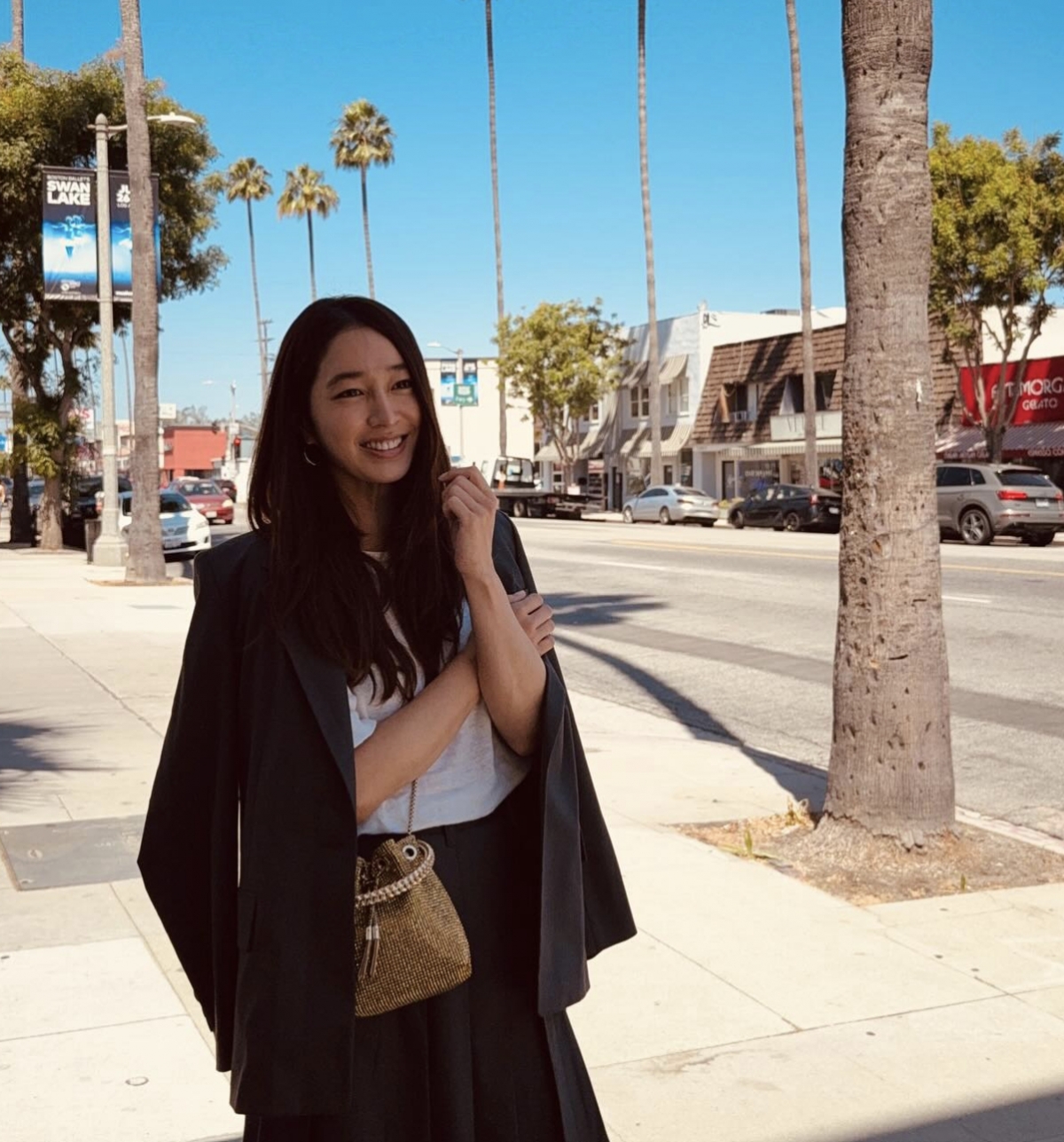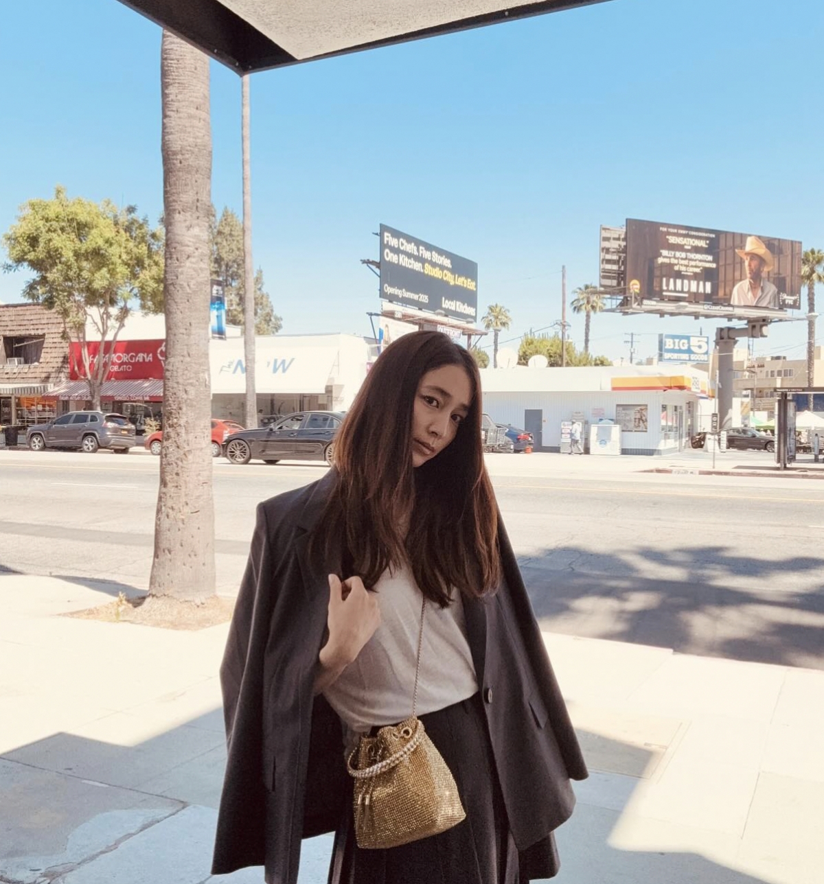 특히 또 다른 사진에서는 홀로 미국의 거리를 배경으로 다양한 포즈를 취하며 여유로운 일상을 즐기는 모습이 담겼다. 흰 티셔츠에 블랙 롱치마를 매치하고, 거기에 무심하게 자켓을 툭 걸친 스타일이 시크하면서도 청순한 매력을 배가시켰다.