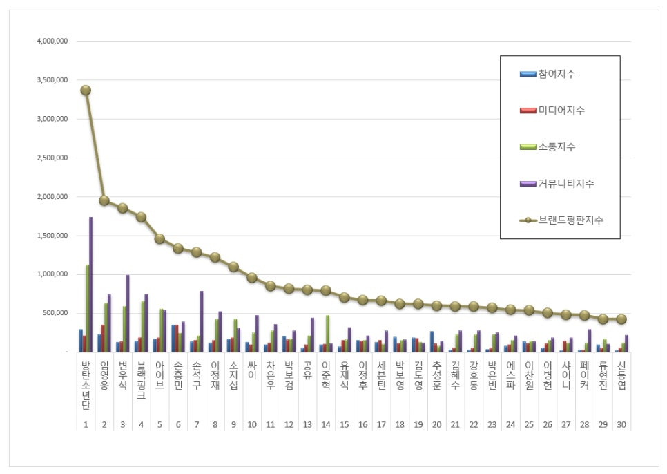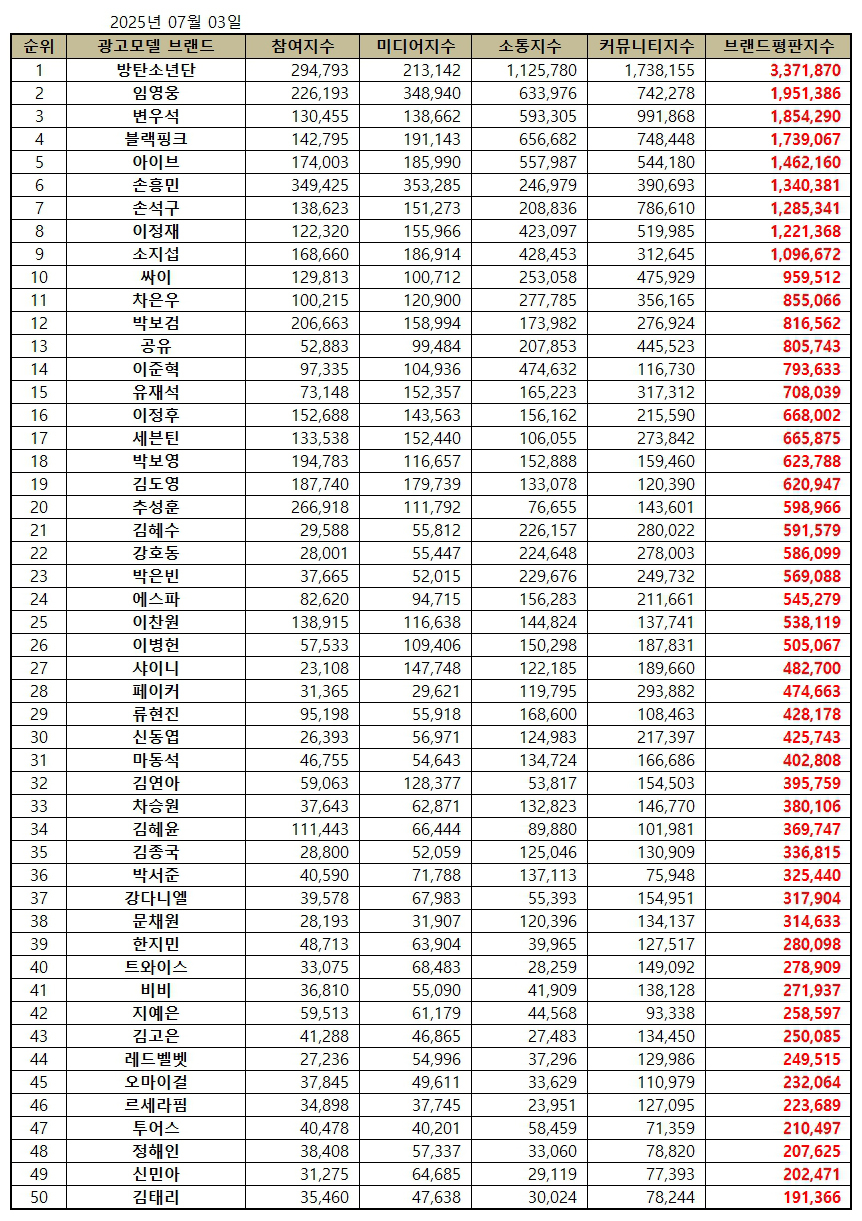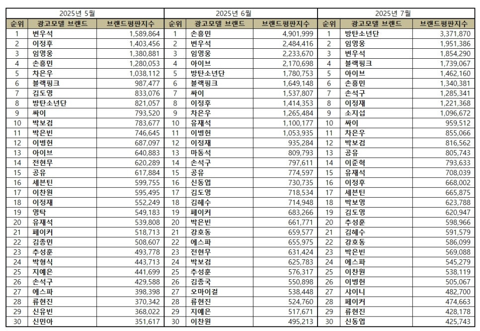 2025년 7월 광고모델 브랜드평판 30위 순위는 방탄소년단, 임영웅, 변우석, 블랙핑크, 아이브, 손흥민, 손석구, 이정재, 소지섭, 싸이, 차은우, 박보검, 공유, 이준혁, 유재석, 이정후, 세븐틴, 박보영, 김도영, 추성훈, 김혜수, 강호동, 박은빈, 에스파, 이찬원, 이병헌, 샤이니, 페이커, 류현진, 신동엽 순으로 분석됐다.