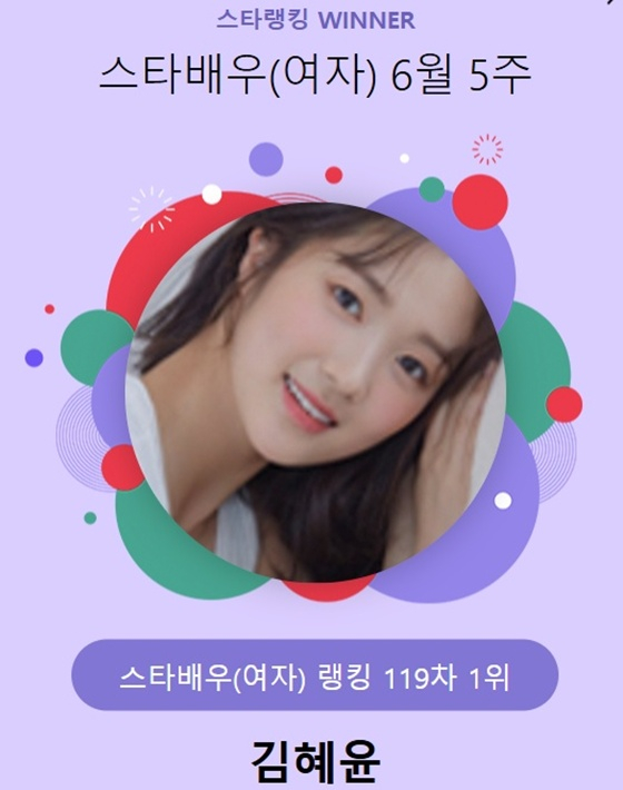 김혜윤은 지난 6월 26일 오후 3시 1분부터 7월 3일 오후 3시까지 진행된 6월 5주(119차) 스타랭킹 스타배우 여자 랭킹 투표에서 1위를 기록했다.