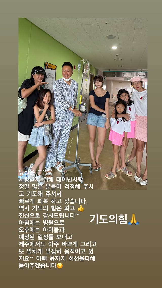 이어 "정말 많은 분들이 걱정해 주시고 기도해 주셔서 빠르게 회복하고 있다. 역시 기도의 힘은 최고"라며 "진심으로 감사드린다. 아침에는 병원으로 오후에는 아이들과 예정된 일정을 보내고 제주에서도 아주 바쁘게 그리고 또 알차게 움직이고 있다. 아빠 몫까지 최선을 다해 놀아주겠다"고 전했다.
