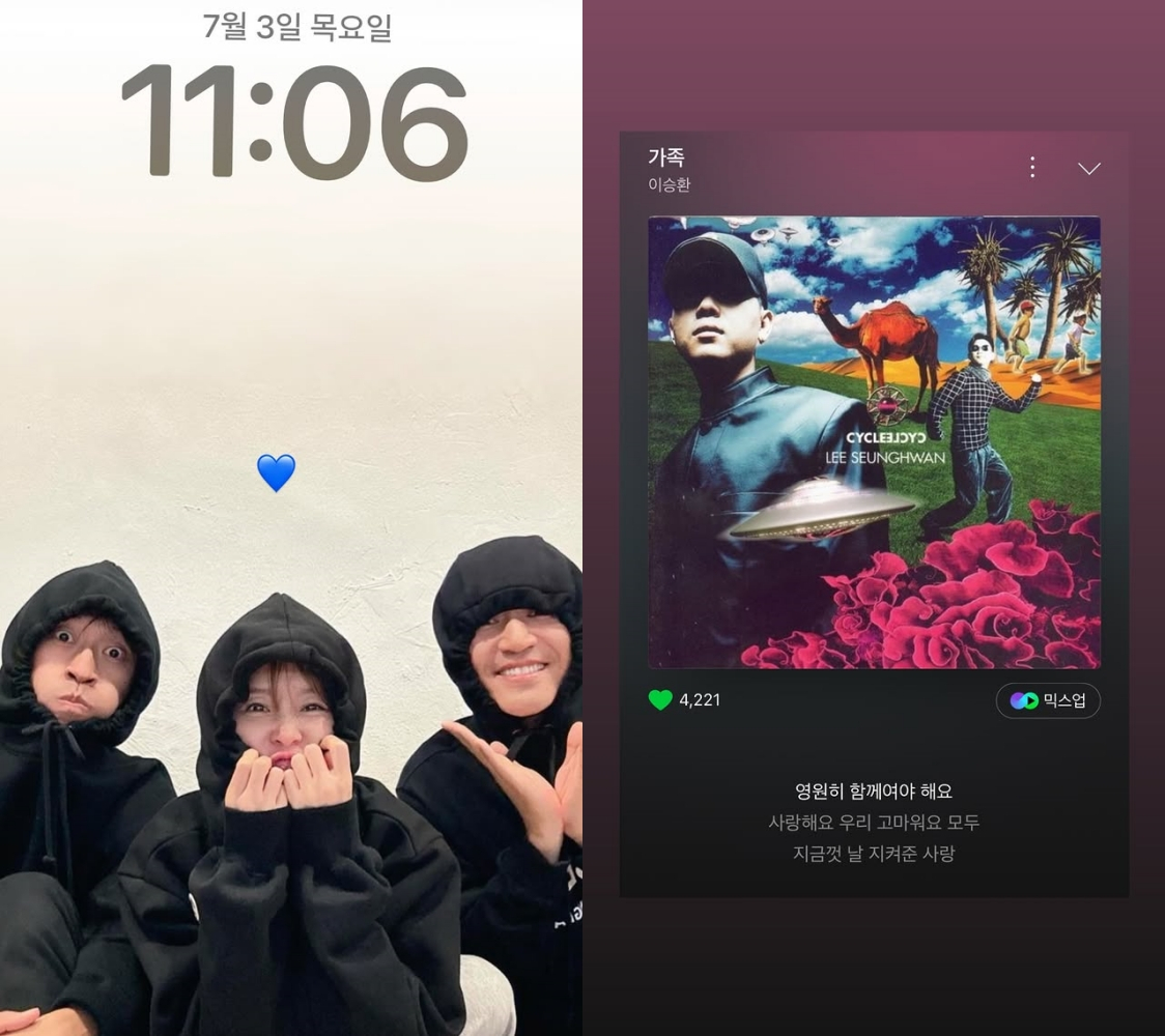 빽가는 3일 자신의 인스타그램에 자신의 인스타그램에 파란색 하트와 함께 핸드폰 배경화면을 공개했다. 핸드폰 화면에는 같은 옷을 맞춰 입은 코요태 세 멤버의 모습이 담겨있다.