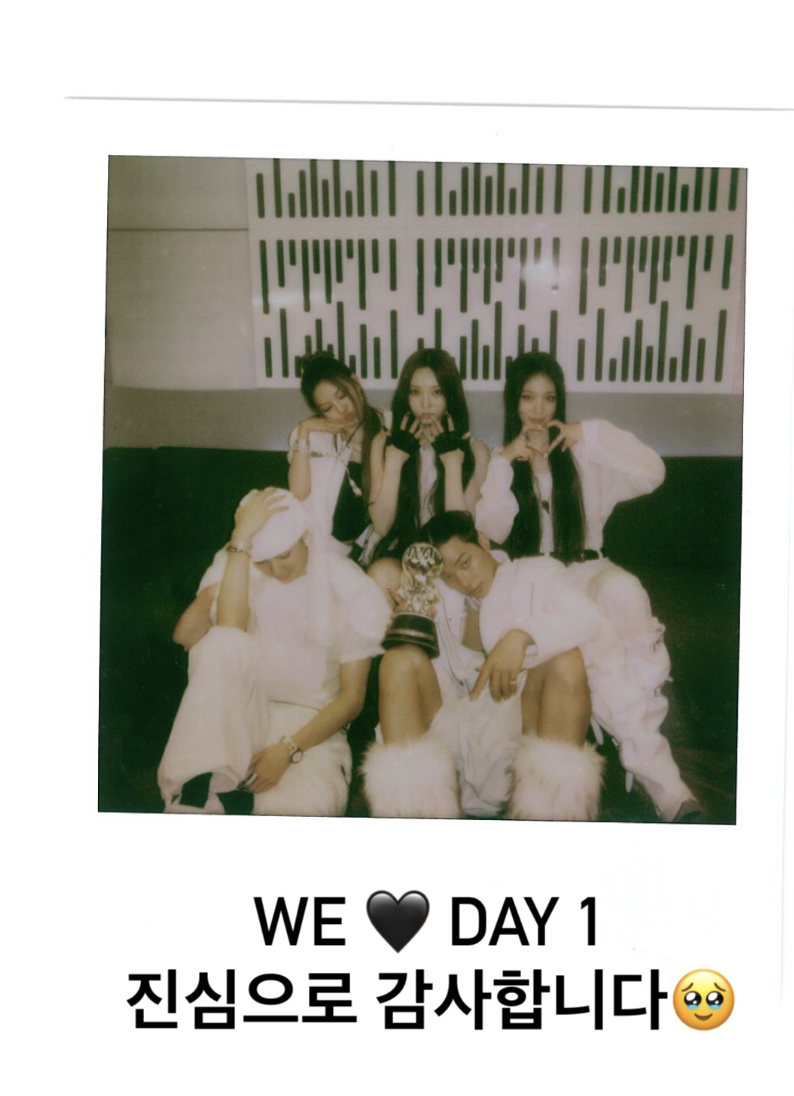 공개된 사진은 폴라로이드 감성으로 담긴 단체샷으로, 멤버들이 대기실에서 트로피를 든 채 앉아 환하게 웃는 모습이 담겼다. 애니와 멤버들의 풋풋한 기쁨이 고스란히 전해지며 팬들에게도 벅찬 감동을 안겼다.