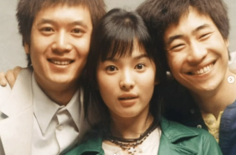 사진 속엔 2004년 방영된 SBS 드라마 '햇빛 쏟아지다'에 출연한 자신과 송혜교, 류승범이 나란히 얼굴을 맞대고 있는 모습이 담겨 있었다.