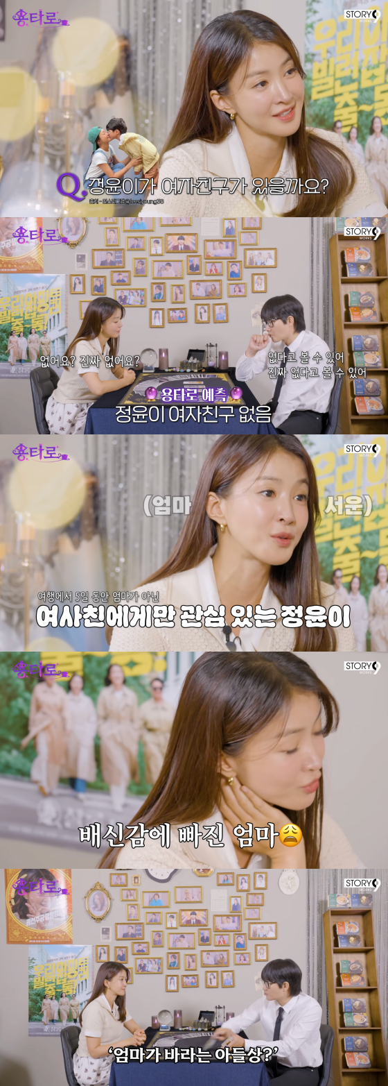 이날 이시영은 "초등학교 1학년인 정윤이한테 여자친구가 있는지 궁금하다"고 질문하며 타로 카드를 뽑았다.