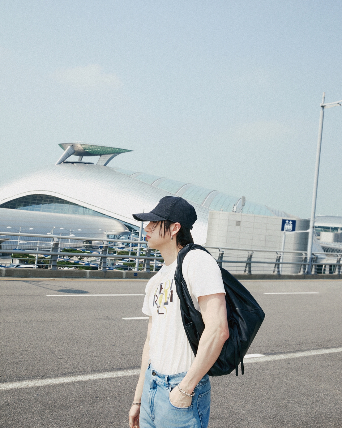 'FENDI ROMA 1925' 문구가 새겨진 화이트 그래픽 티셔츠에 여유로운 핏의 데님 진, FF 로고 베이스볼 캡을 매치해 럭셔리함과 편안함이 조화를 이루는 공항패션을 연출했다.