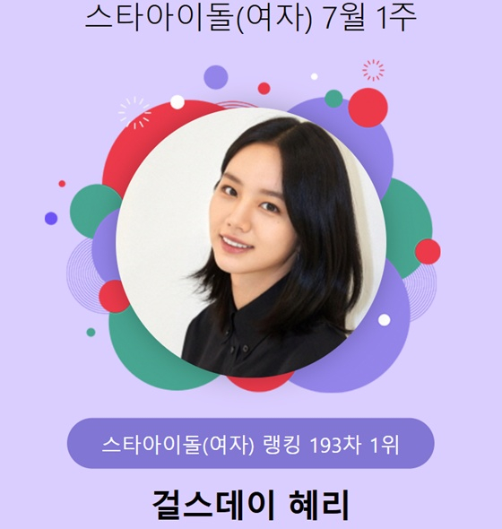 혜리는 지난 3일 오후 3시 1분부터 10일 오후 3시까지 진행된 7월 1주(193차) 스타랭킹 스타아이돌 여자 부문 랭킹 투표에서 2만 3표를 획득하며 1위에 올랐다.