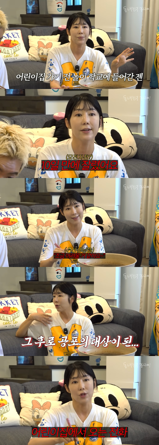 사유리는 "젠이 어린이집 가기 전 놀이학교에 들어갔다. 그런데 10일 만에 잘렸다. (놀이학교 측에서) '어머니, 젠이 좀 어려울 것 같아요'라고 하더라. 고집이 너무 세서 자기 하고 싶은대로 한 모양"이라고 털어놨다.