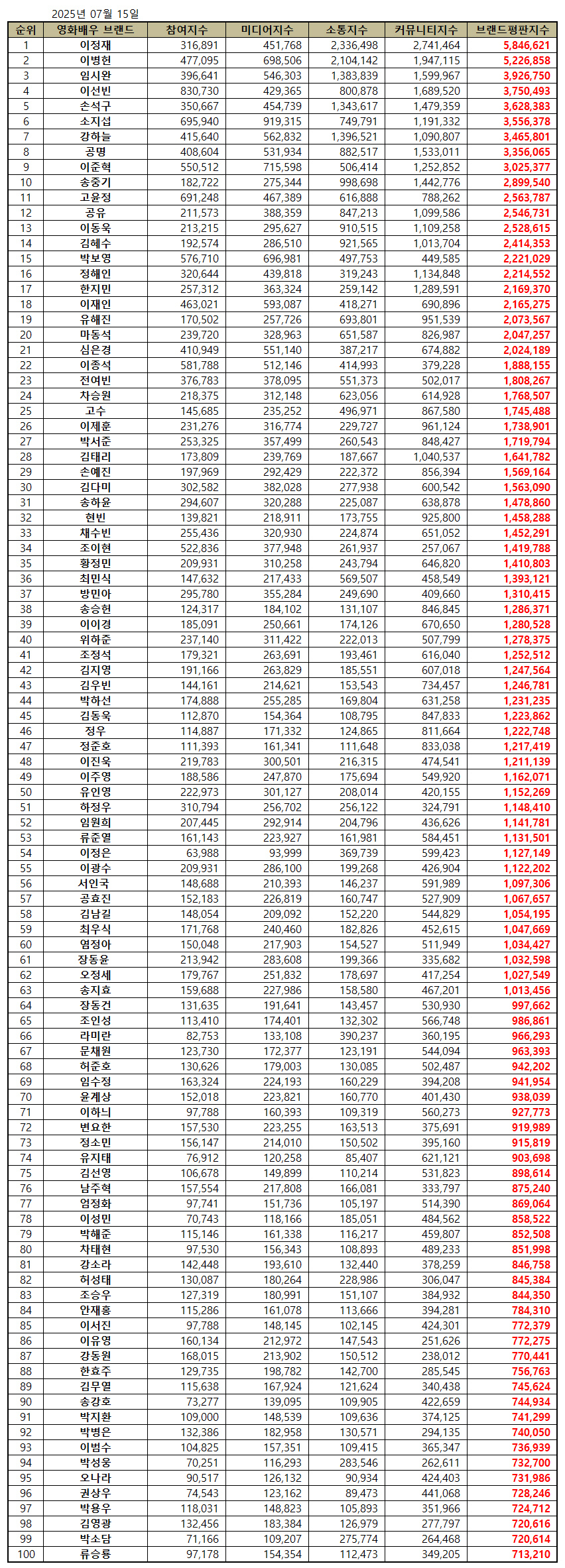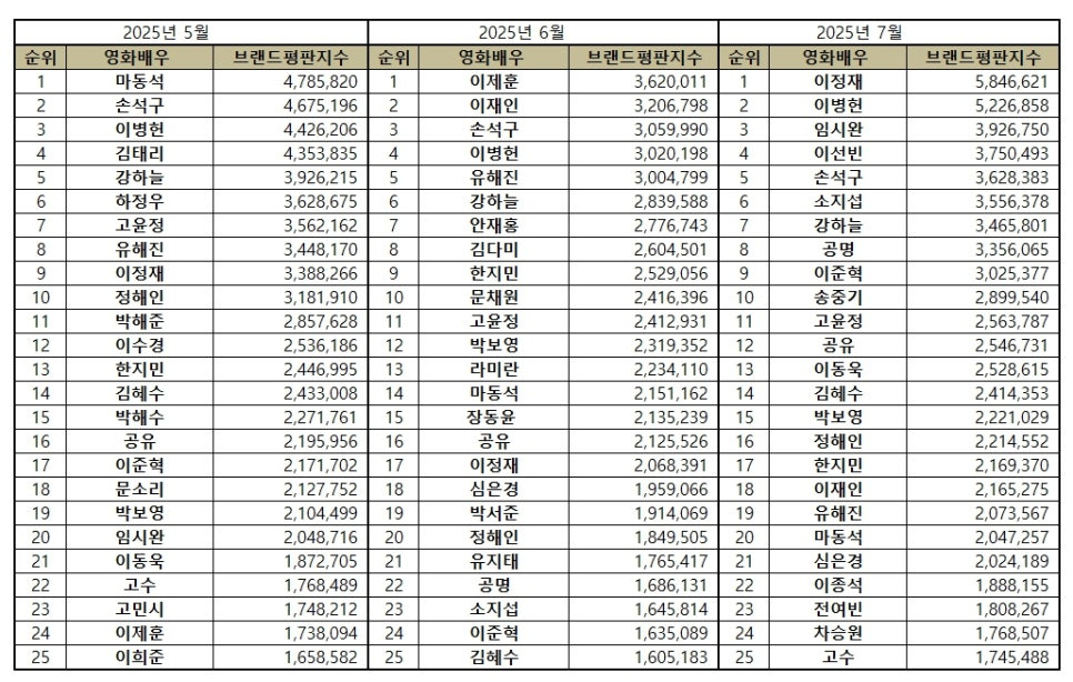 2025년 7월 영화배우 브랜드평판 30위 순위는 이정재, 이병헌, 임시완, 이선빈, 손석구, 소지섭, 강하늘, 공명, 이준혁, 송중기, 고윤정, 공유, 이동욱, 김혜수, 박보영, 정해인, 한지민, 이재인, 유해진, 마동석, 심은경, 이종석, 전여빈, 차승원, 고수, 이제훈, 박서준, 김태리, 손예진, 김다미 순이었다.
