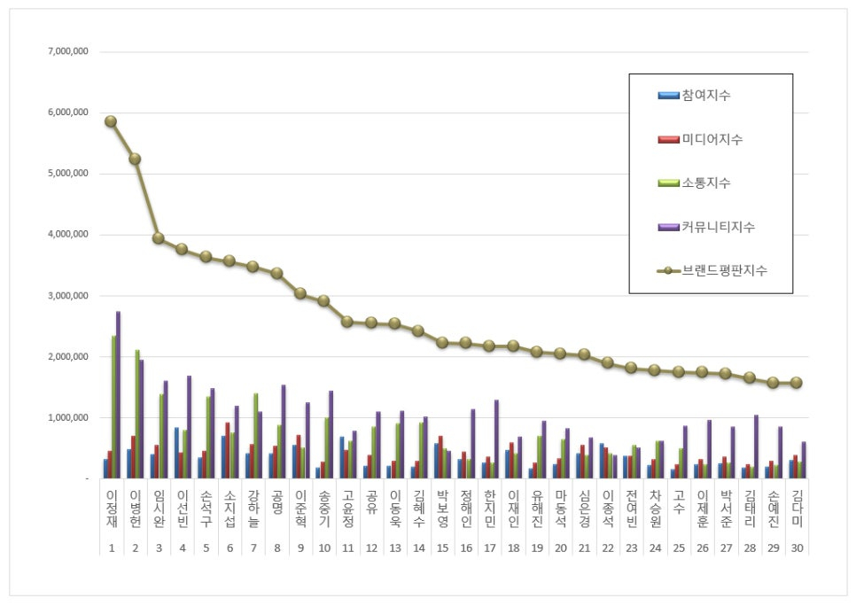 3위, 임시완 브랜드는 참여지수 396,641 미디어지수 546,303 소통지수 1,383,839 커뮤니티지수 1,599,967이 되면서 브랜드평판지수 3,926,750으로 분석됐다.
