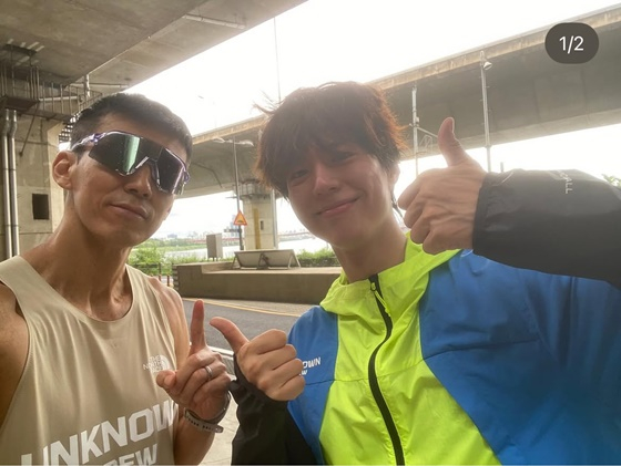 션은 15일 자신의 인스타그램에 "새벽 우중런. 보검이와 함께 60분 11.37km 러닝을 했다"라는 글과 함께 박보검과 함께 한 인증샷을 게재했다.