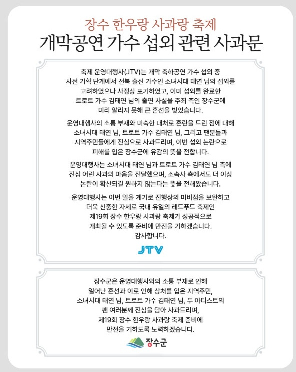 이 가운데 장수군청은 18일 오후 공식 인스타그램 계정에 뒤늦은 사과문을 발표했다. 이들은 "장수군은 운영대행사와의 소통 부재로 인해 일어난 혼선과 이로 인해 상처를 입은 지역주민, 소녀시대 태연 님, 트로트 가수 김태연 님, 두 아티스트의 팬 여러분께 진심을 담아 사과드린다. '제19회 장수 한우랑 사과랑' 축제 준비에 만전을 기하도록 노력하겠다"라고 밝혔다.