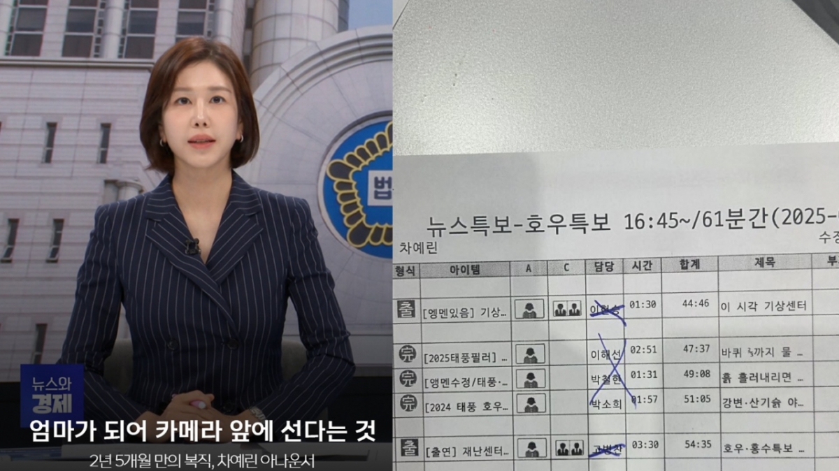 차예린 아나운서는 지난 17일 "15분으로 편성됐던 호우특보가 방송 직전, 61분으로 확대됐다"라며 "첫째 어린이집 하원시키는 날이었는데, 연락 한 통도 못 한 채 생방송에 들어갔다"라고 언급했다.