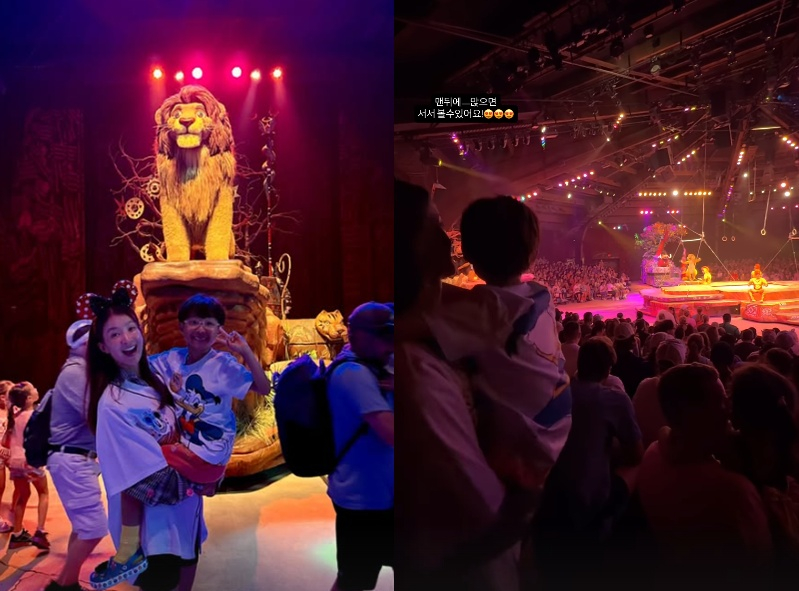 이시영은 라이언킹 공연을 보며 맨뒤에서 정윤 군을 품에 안고 있어 시선을 모은다.