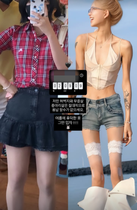 앞서 최준희는 자신의 과거 모습에 대해 "저딴 허벅지와 무릎살, 종아리살은 절대적으로 용납할 수가 없다. 여름에 후덕한 옷 그만 입자"고 설명했다.