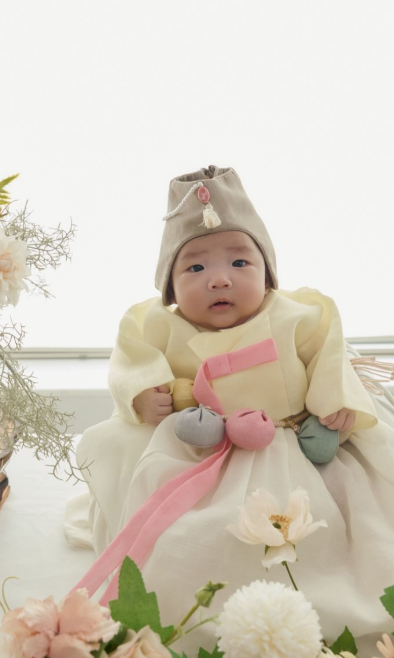 사진 속 해이는 예쁜 한복을 입고 카메라를 응시하고 있다.