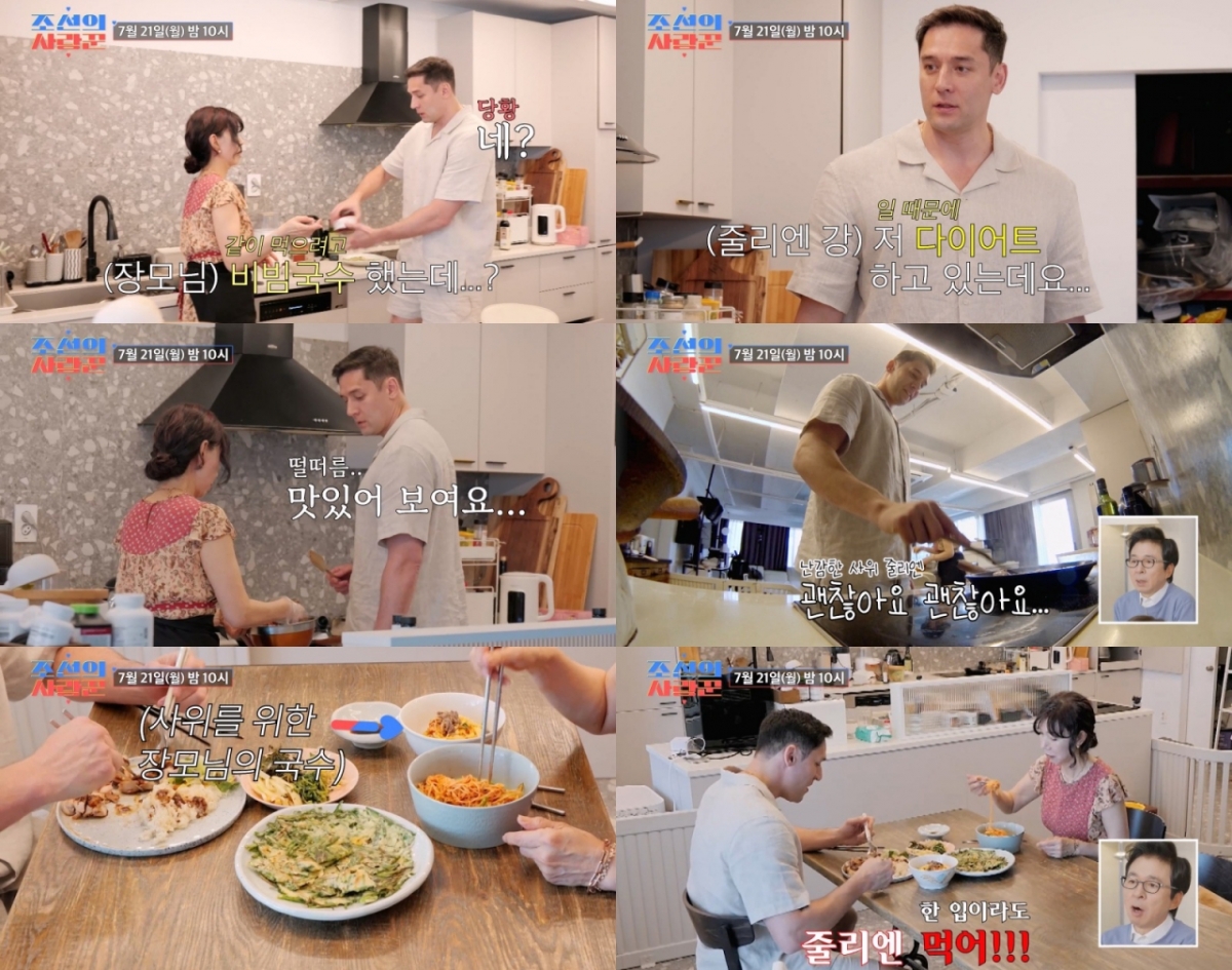 장모는 "줄리엔이 국수를 되게 좋아한다"라면서 맛깔나는 비빔국수와 부추전을 만들어 MC들의 탄성을 자아냈다. 하지만 뒤늦게 부엌에 도착한 줄리엔 강은 "왜 이렇게 많이 만들었냐"라고 어리둥절했다. 장모는 "같이 먹으려고 했다"라고 대답했지만, 줄리엔 강은 "누구한테요? 나한테요?"라며 말끝을 흐렸다.