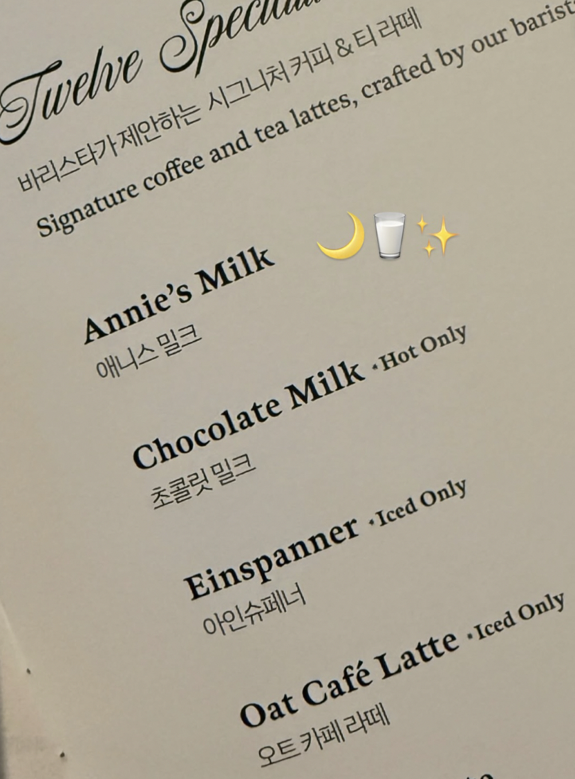 이날 공개된 또 다른 사진에서는 'Annie's Milk'라는 문구가 적힌 우유 메뉴판을 촬영한 모습도 담겼다. 자신의 이름이 들어간 제품을 발견한 애니는 해당 사진에 달과 우유 이모티콘을 덧붙이며 반가운 마음을 드러내 보는 이들의 미소를 자아냈다.