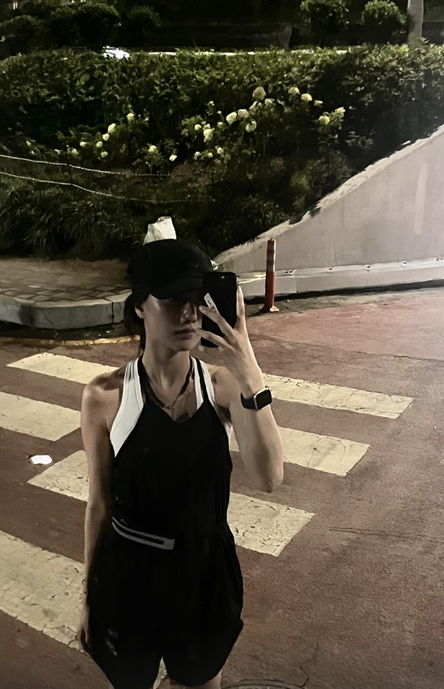 이어진 또 다른 사진에서는 러닝을 마친 뒤 땀기가 맺힌 얼굴로 민소매에 캡모자를 쓴 채 거울 앞에서 셀카를 찍은 모습이 담겼다. 내추럴하면서도 건강미 넘치는 러닝룩으로 팬들의 이목을 집중시켰다.