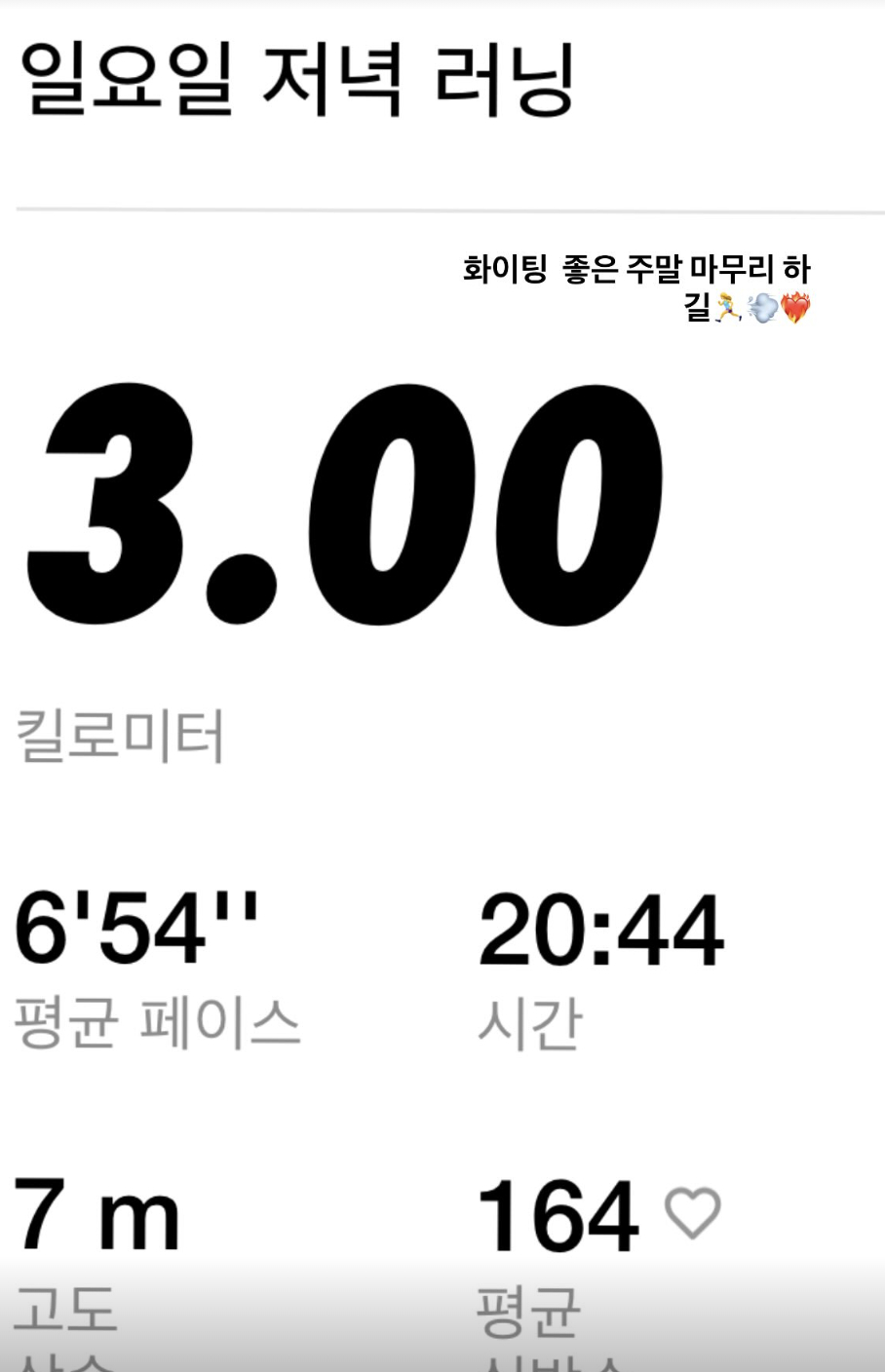 12일 이나은은 자신의 SNS에 "화이팅 좋은 주말 마무리 하길"이라는 짧은 멘트와 함께 러닝 인증샷을 게재했다. 공개된 사진 속에는 3km를 평균 페이스 6분 54초로 달린 러닝 기록이 담겨 있어 눈길을 끌었다.