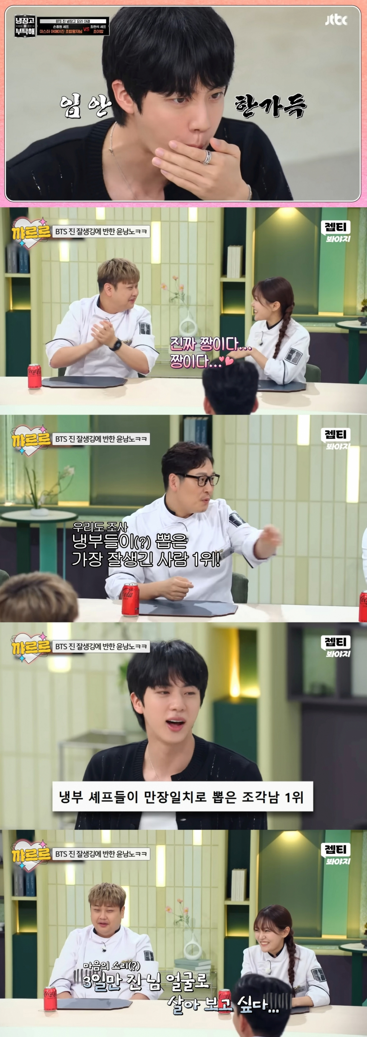 특히 미국 스타 셰프 에드워드 리는 진을 만나고 싶어 미국에서부터 먼 거리를 단숨에 달려왔다고 전했다. 진이 등장하자 셰프들은 비현실적인 진의 비주얼과 예의바르게 인사하며 악수를 나누는 진의 매너에 감탄하며 찬사를 보냈다. 박은영 셰프는 진을 보자마자 "진짜 짱이다!"라고 외쳤으며 윤남노 셰프는 시종일관 진에게 "너무 잘생겼다", "진 얼굴로 3일만 살아보고 싶다"며 진에게 푹 빠진 모습을 보였다. 진의 외모에 감탄한 김풍 셰프의 건의로 '냉부해 셰프들이 뽑은 가장 잘생긴 얼굴 1위' 투표를 진행했고, 거수로 셰프들의 만장일치로 진은 1위에 등극했다. MC 김성주는 '냉부 셰프들이 만장일치로 뽑은 조각남 1위'라고 발표했으며 윤남노 셰프는 3일만 진 님 얼굴로 살아보고 싶다고 말했다.