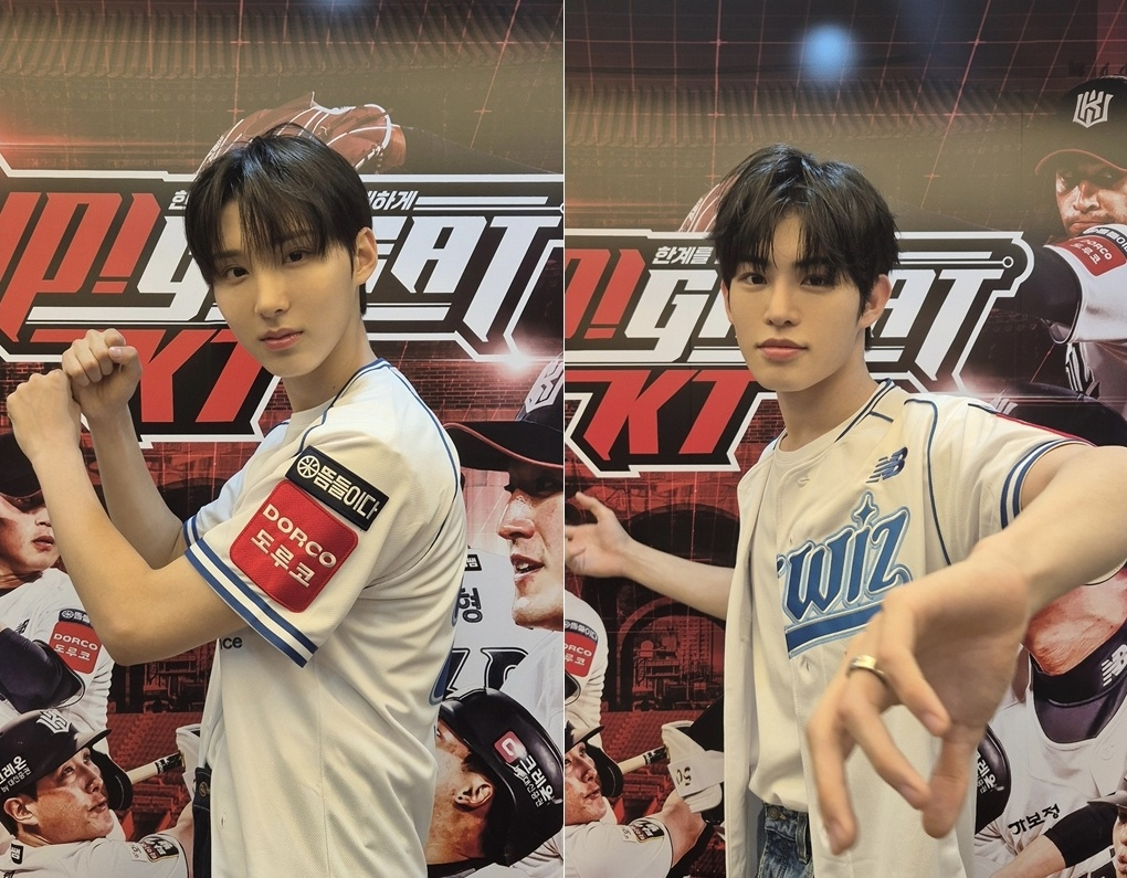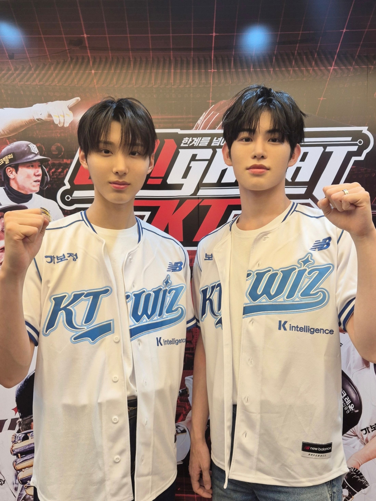 JYP엔터테인먼트 보이그룹 킥플립(KickFlip) 주왕과 민제가 데뷔 첫 프로야구 시구 및 시타자로 나섰다.