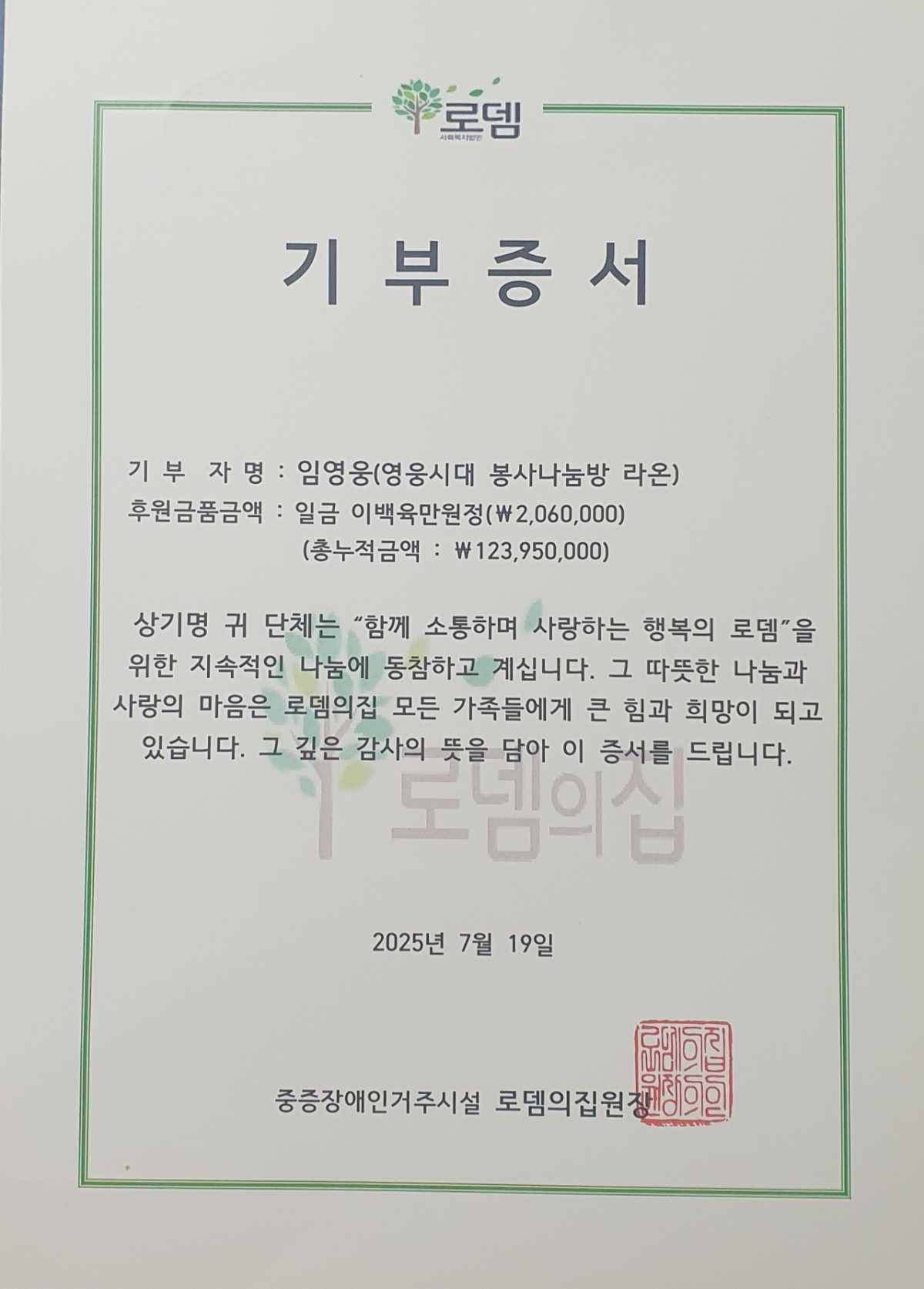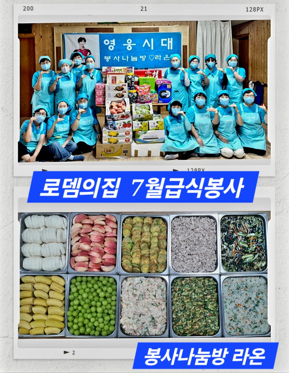 임영웅 팬클럽 영웅시대 봉사나눔방 '라온'은 7월 19일 경기도 양평 로뎀의집에서 49번째 급식봉사와 기부(206만 원)를 했다.