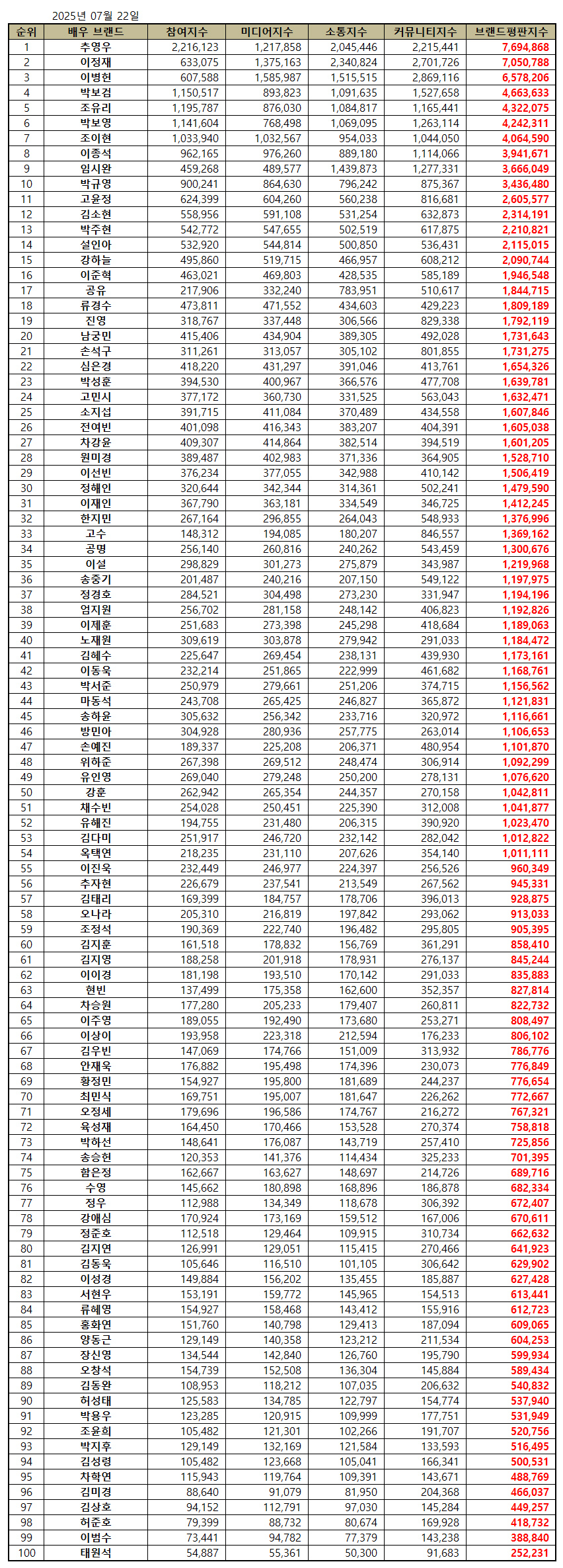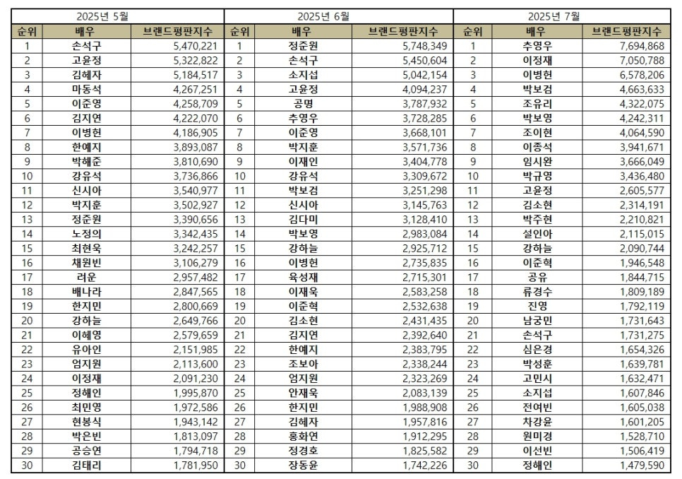 한국기업평판연구소는 2025년 6월 22일부터 2025년 7월 22일까지 방영한 드라마, 영화, OTT에서 출연중인 배우 100명의 브랜드 빅데이터 145,034,155개를 소비자들의 브랜드 참여량, 미디어량, 소통량, 커뮤니티량으로 측정하여 브랜드평판 알고리즘으로 지수화했다. 지난 6월 배우 브랜드 빅데이터 162,092,347개와 비교하면 10.52% 줄어들었다.