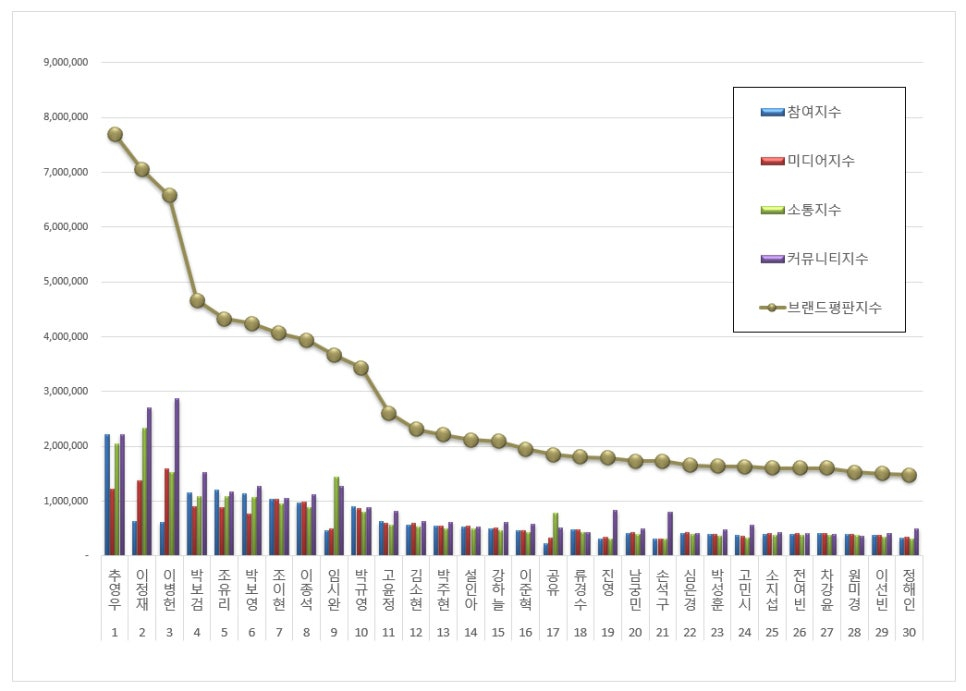 배우 브랜드평판 1위를 기록한 추영우 브랜드는 참여지수 2,216,123 미디어지수 1,217,858 소통지수 2,045,446 커뮤니티지수 2,215,441이 되면서 브랜드평판지수 7,694,868로 분석됐다.