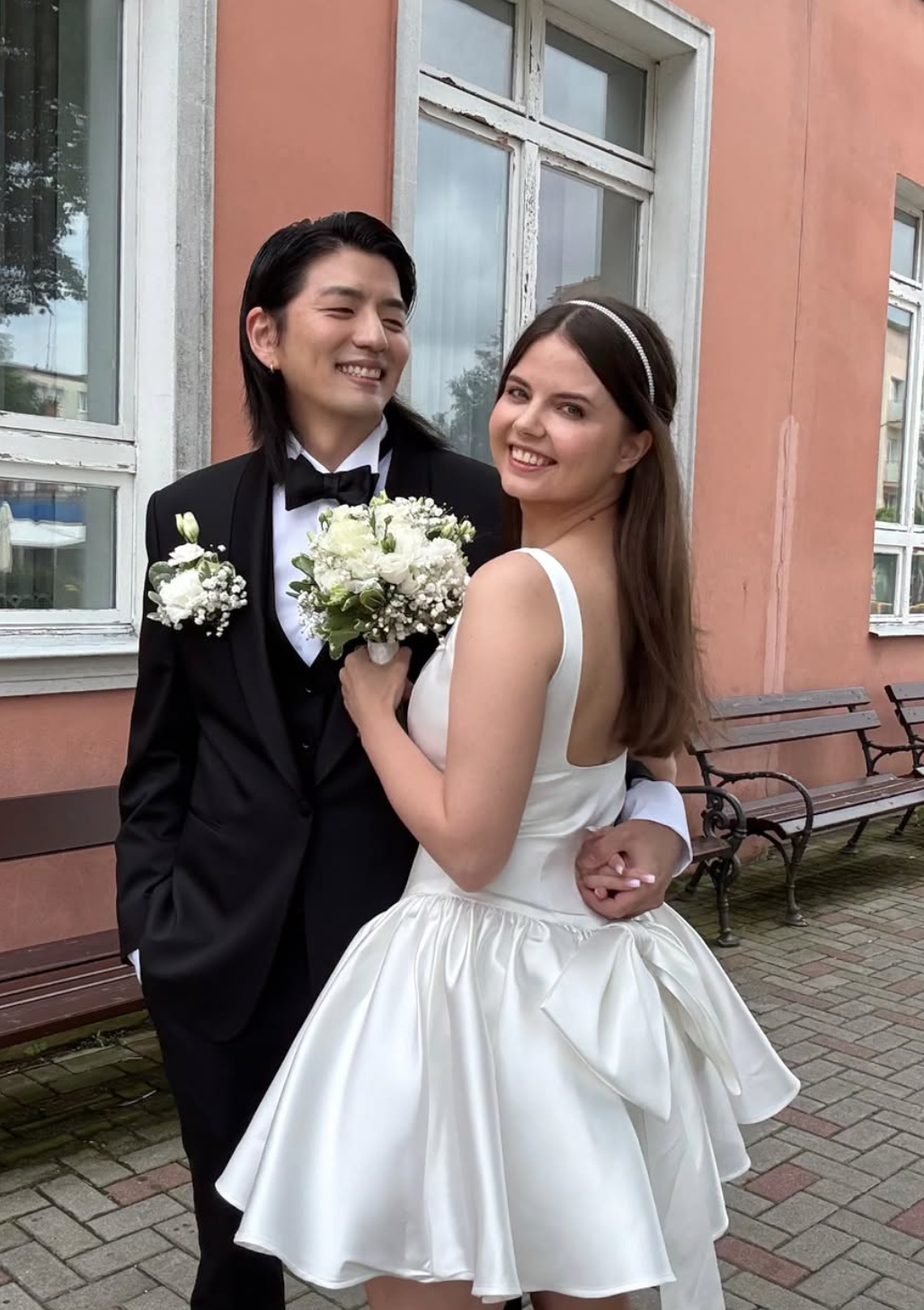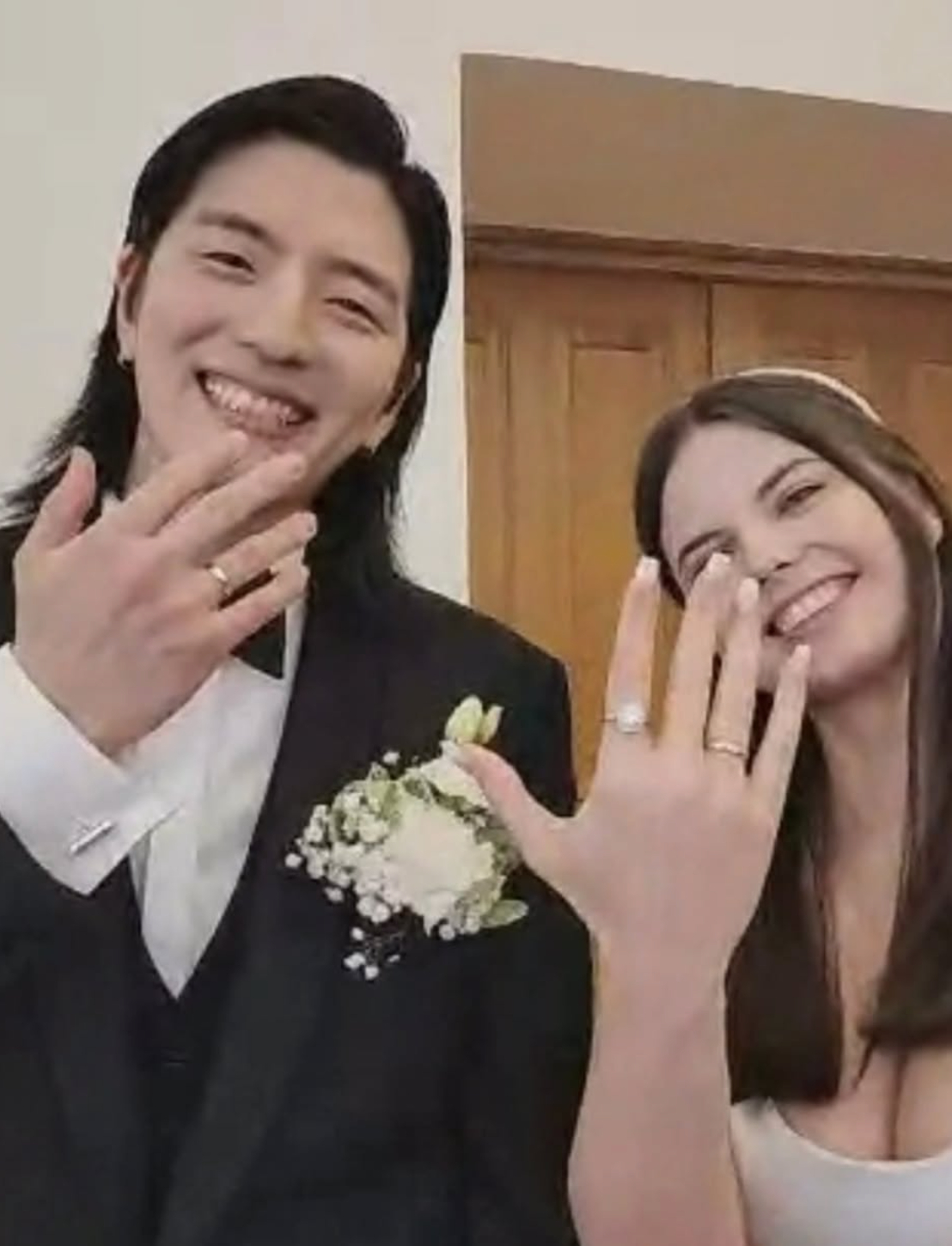 사진 속 두 사람은 각각 턱시도와 웨딩드레스를 입고 포즈를 취했으며 결혼 반지도 직접 인증하고 있다.