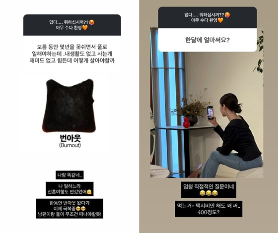 또 다른 팬은 "보름 동안 몇 년을 못 쉬면서 풀로 일해야 하는데. 내 생활도 없고 사는 게 재미도 없고 힘든데 어떻게 살아야 할까"라고 했다. 미자는 팬의 고민에 공감하며 "나랑 똑같네. 나 일하느라 신혼여행도 안 갔었다"며 "한동안 번아웃 왔다가 이제 극복 중. 남편이랑 둘이 무조건 떠나야 할 듯"이라고 답했다.