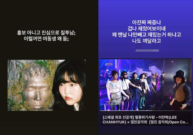 이수현은 22일 이찬혁의 KBS '열린음악회' 무대 스페셜 선공개 영상을 게재하며 "아 진짜 짜증나 겁나 재미있어 보이네. 왜 맨날 나만 빼고 재밌는 거 하냐고 나도 껴달라고"라며 "홍보 아니고 진심으로 질투남. 이럴거면 여동생 왜 둠"이라고 밝혔다.