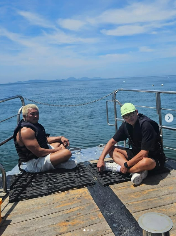 사진 속 하정우는 추성훈과 바닷가에서 낚시를 하고 있는 모습. 구명조끼를 입고 있는 두 사람은 무더위에 지친 듯 허탈한 표정을 지으며 허공을 바라보고 있다.