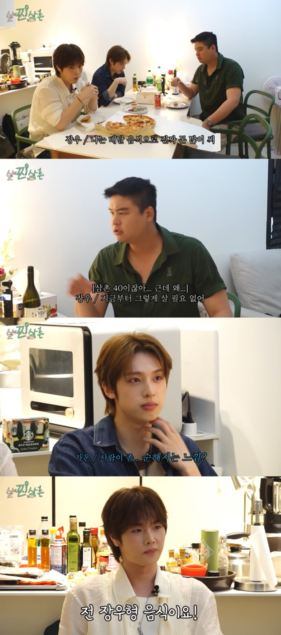 이장우는 배달시킨 피자를 먹으며 "나는 배달 음식으로 돈 진짜 많이 쓴다"고 밝혔다. 이를 들은 가온, 정수도 "저희도 그런 거 같다"며 "사실 회사에서 유기농 식당을 무료로 먹는데 잘 안 간다"고 전했다.