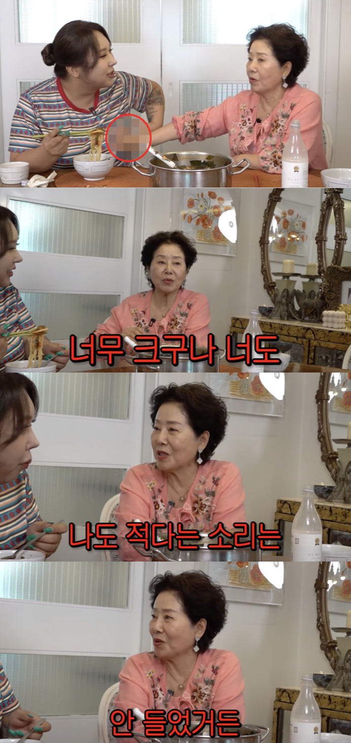이를 듣던 선우용여는 풍자의 팔뚝을 만지다가 실수로 풍자의 가슴을 만지게 됐고, 뒤늦게 이 사실을 깨닫고서는 "너무 크구나, 너도. 나도 적다는 소리는 안 들었다"라며 흐뭇한 미소를 지어 웃음을 자아냈다.