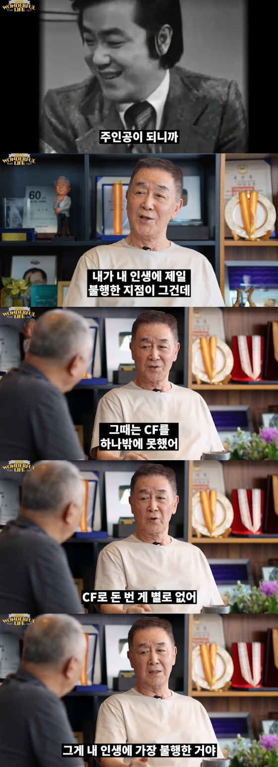 그는 "내 다음에 배우 유인촌이 나오면서 CF를 열 개씩 찍고 그랬지, 우리 때는 한 개였다. 전속을 20년 한 사람이 CF로 돈 번 게 별로 없다. 그게 내 인생에 가장 불행한 것"이라고 토로했다.