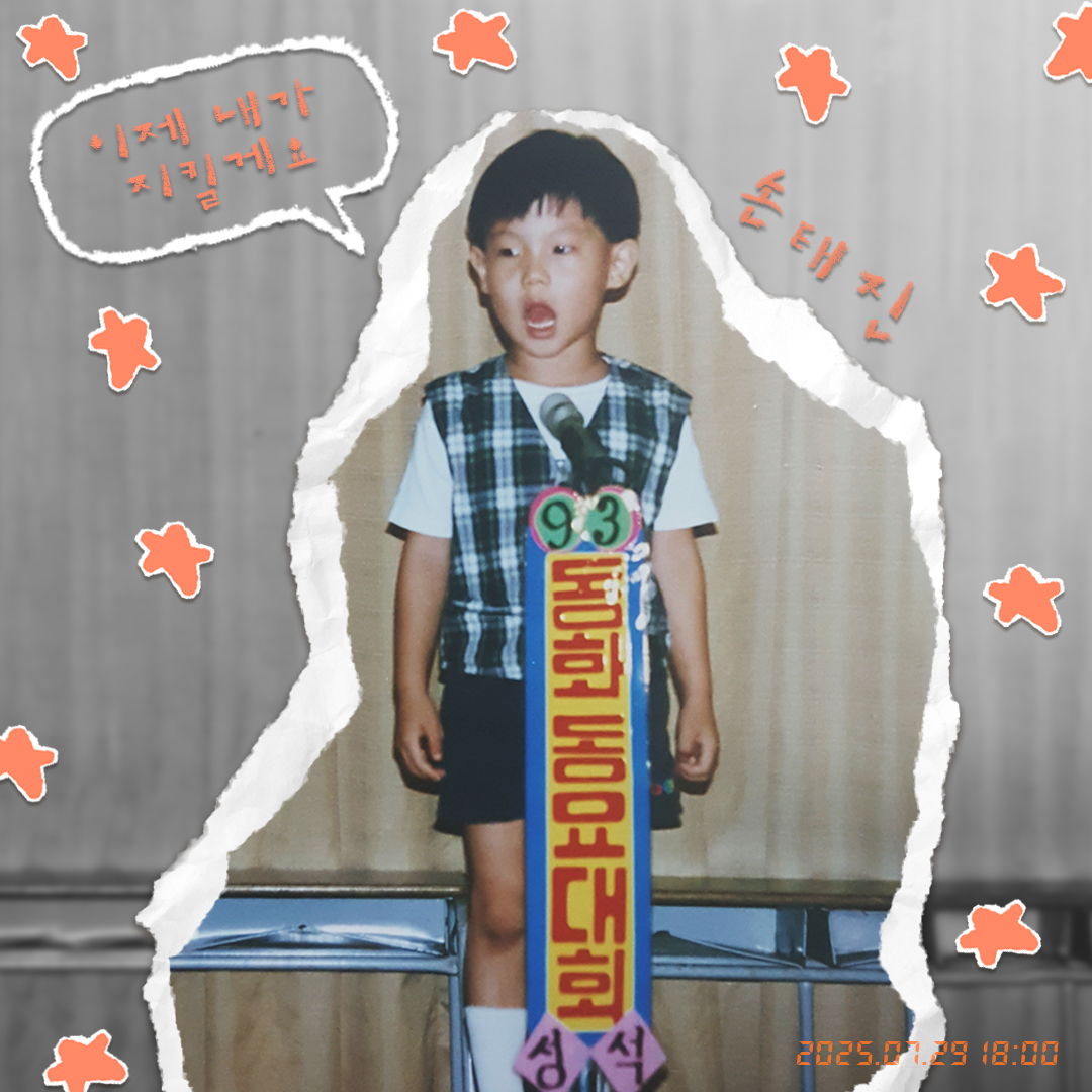 이미지 속 손태진은 '동요 대회'에 참여한 듯 무대 위에서 노래하는 꼬마의 모습이다. 반짝이는 눈망울과 순수한 표정, 작고 귀여운 체구가 어우러져 유년 시절의 따뜻한 감성을 자아내며, 여기에 "이제 내가 지킬게요"라는 손글씨 말풍선과 아기자기한 그래픽 요소는 정겨운 '효(孝)'의 메시지를 친근하게 전한다.