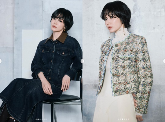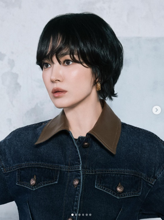 공개된 사진 속 송혜교는 쇼트 커트 헤어스타일로 우아한 모습을 보여준다.