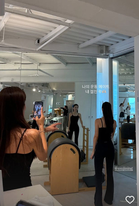 사진 속 김성은과 박수진은 거울 앞에서 함께 운동. 오랜만에 친구를 통해 공개된 사진 속 박수진은 여전히 늘씬하고 아름다운 미모로 시선을 사로잡는다.