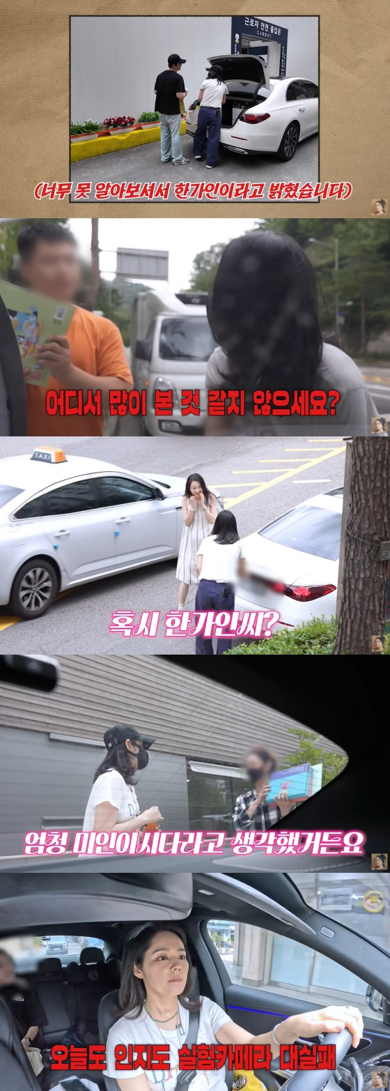 이후 한가인은 여러 사람들과 만나 물품을 나눔했다. 한가인은 "보통 눈 마주치면 저인지 안다"고 자신감을 드러냈지만 결과는 뜻밖에도 대실패였다.