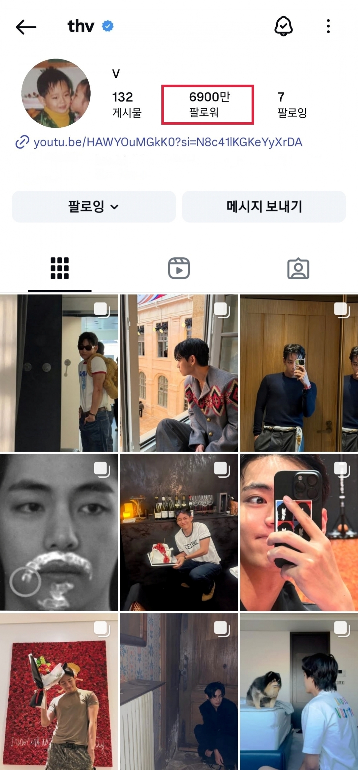 방탄소년단(BTS) 뷔가 인스타그램 팔로워 6900만 명을 돌파하며 글로벌 슈퍼스타 존재감을 빛냈다.